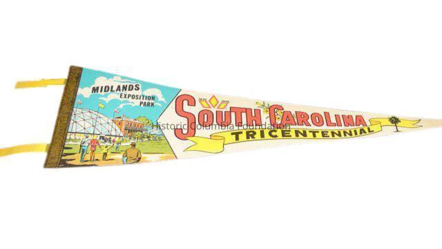 Pennant highlighting the South Carolina Tricentennial Celebration in 1970. The pennant has various colors with a picture of the grounds at Hampton-Preston on the left and "Midlands Exposition Park" printed above it. The right side is printed with the tricentennial logo. "South Carolina" is printed in large red letters above "Tricentennial," which is printed in black font on a yellow ribbon. A depiction of the state flower, the yellow jessamine, appears behind "Carolina," and a black palmetto tree is depicted near the point of the banner in from of the yellow ribbon.Context