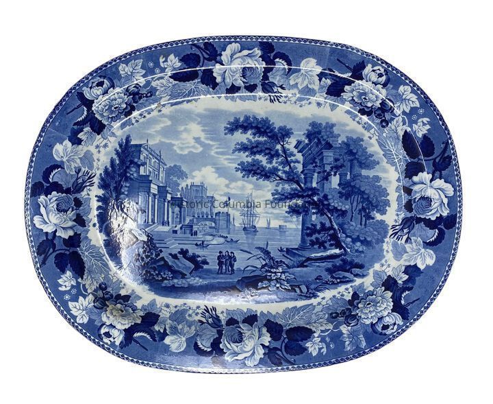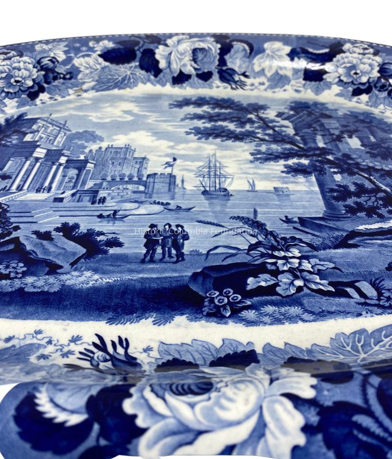 Wedgwood ironstone turkey platter with blue transfer design and large floral border. The central scene shows ships sailing in a continental harbor with three men standing by the water's edge. Several smaller row boats also appear in the harbor, which is surround by classical buildings, bridges, and foliage.Context