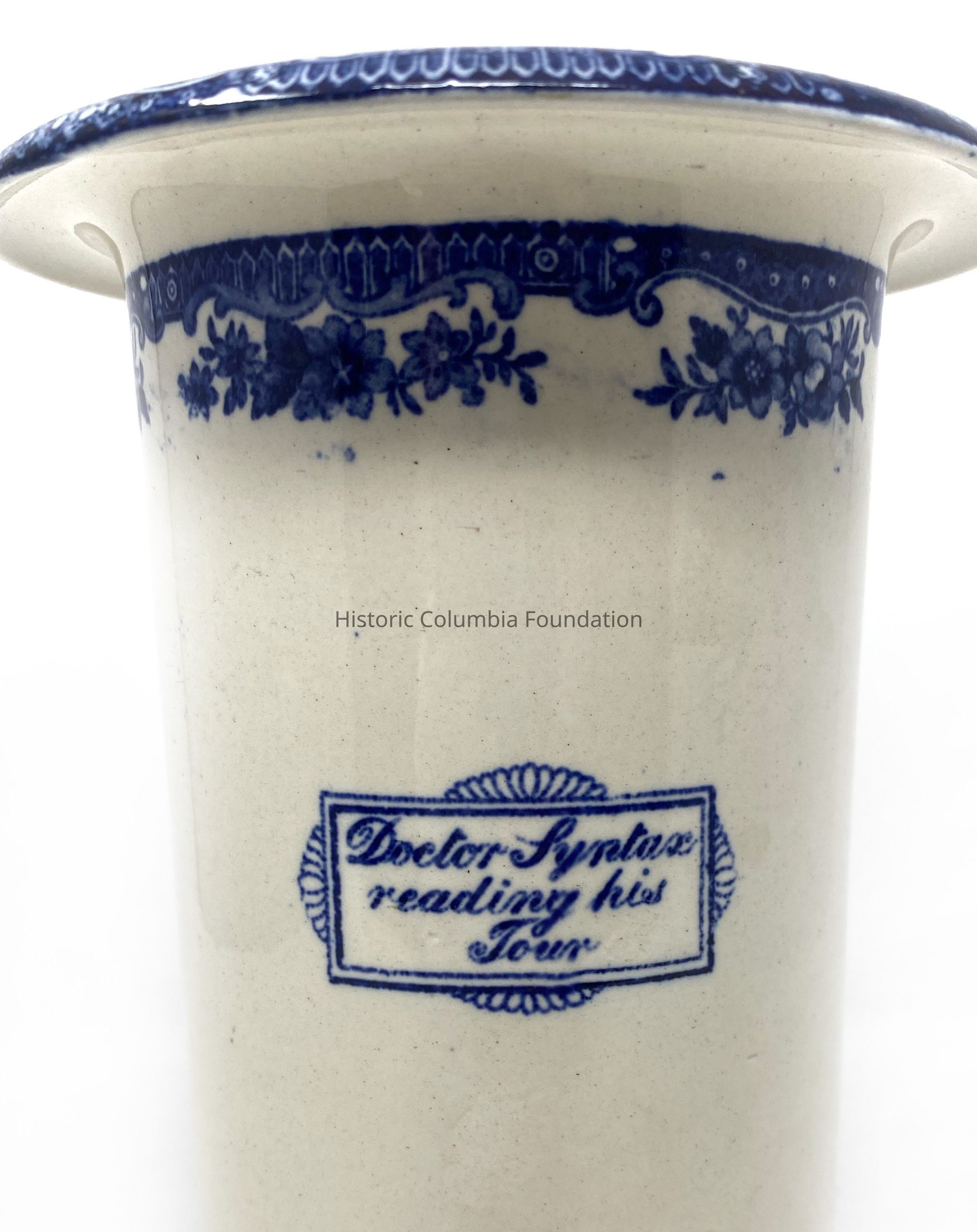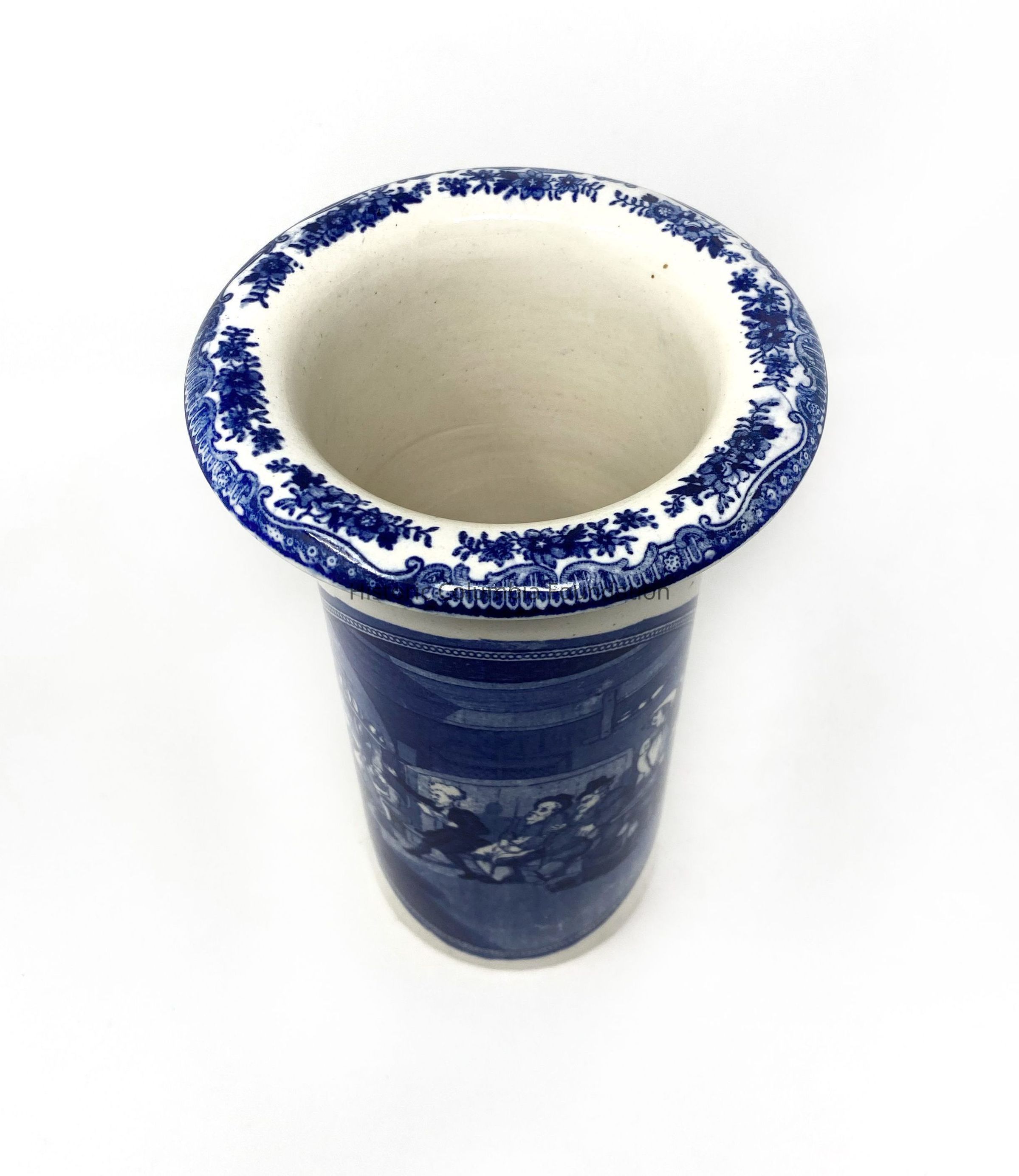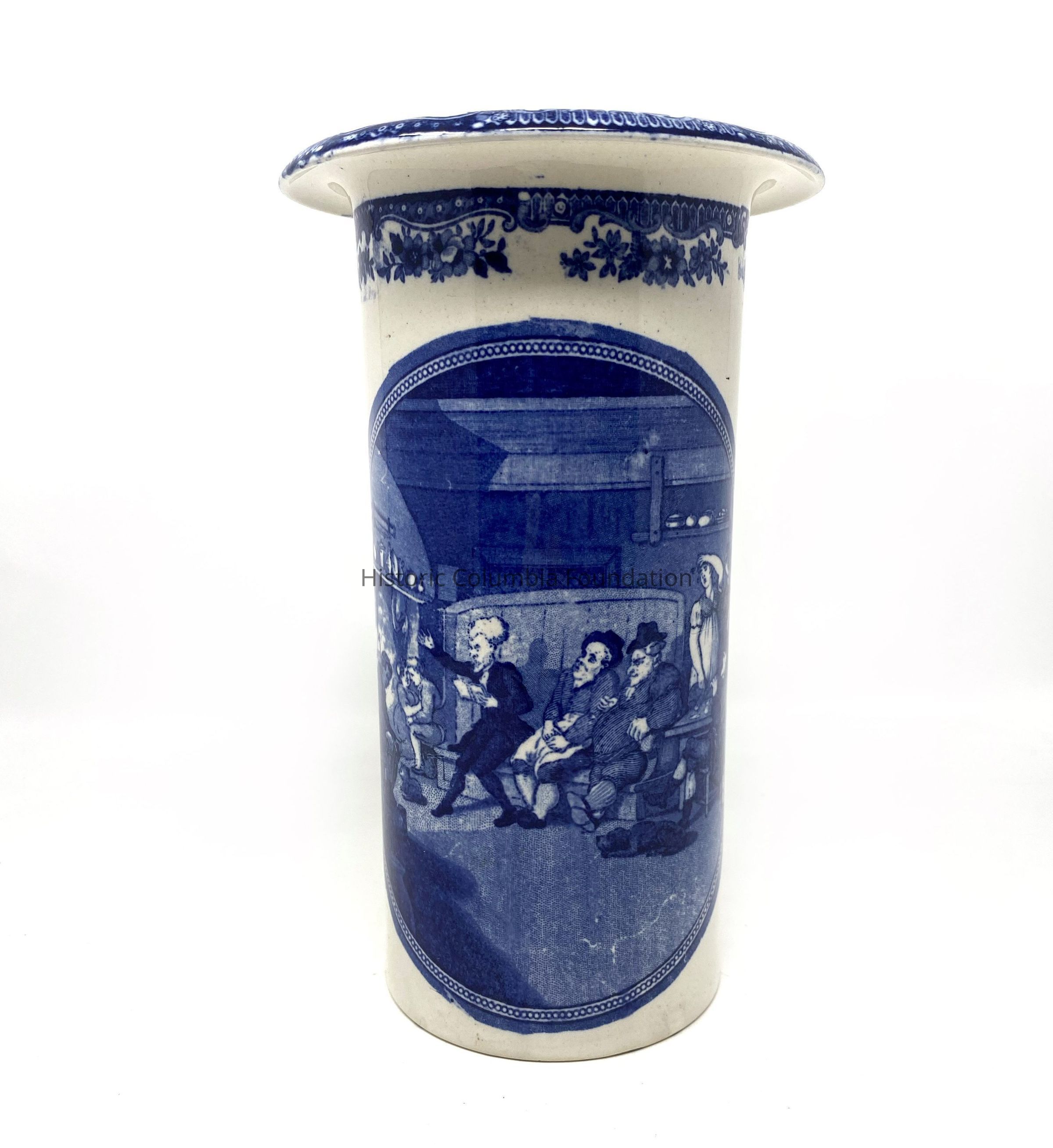 Blue and white Staffordshire soft paste cylindrical vase featuring a transfer scene on the front of the vase. The scene depicts a man in a white wig and black clothing reading from a book aloud to a group of people. The group is near a fireplace that appears to be warming a caldron. Various jugs and vessels rest on the mantel and a gun is mounted above it on the wall. Several of the listeners appear disinterested in the man's tales, as are a dog and cat asleep on the floor. According to a label on the reverse of the vase, the scene is of "Doctor Syntax Reading His Tour."Context