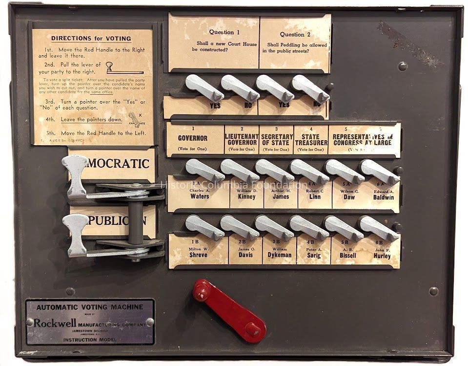 Instructional machines like this one familiarized voters on how to operate an actual automatic voting machine (AVM) in order to avoid mistakes on Election Day. In general, voting machines like this were superior in comparison to a ballot box; AVMs kept a running count of votes, while totaling votes in ballot boxes could take hours to days. Additionally, an AVM could be locked by poll officials, reducing the chance of voter fraud.