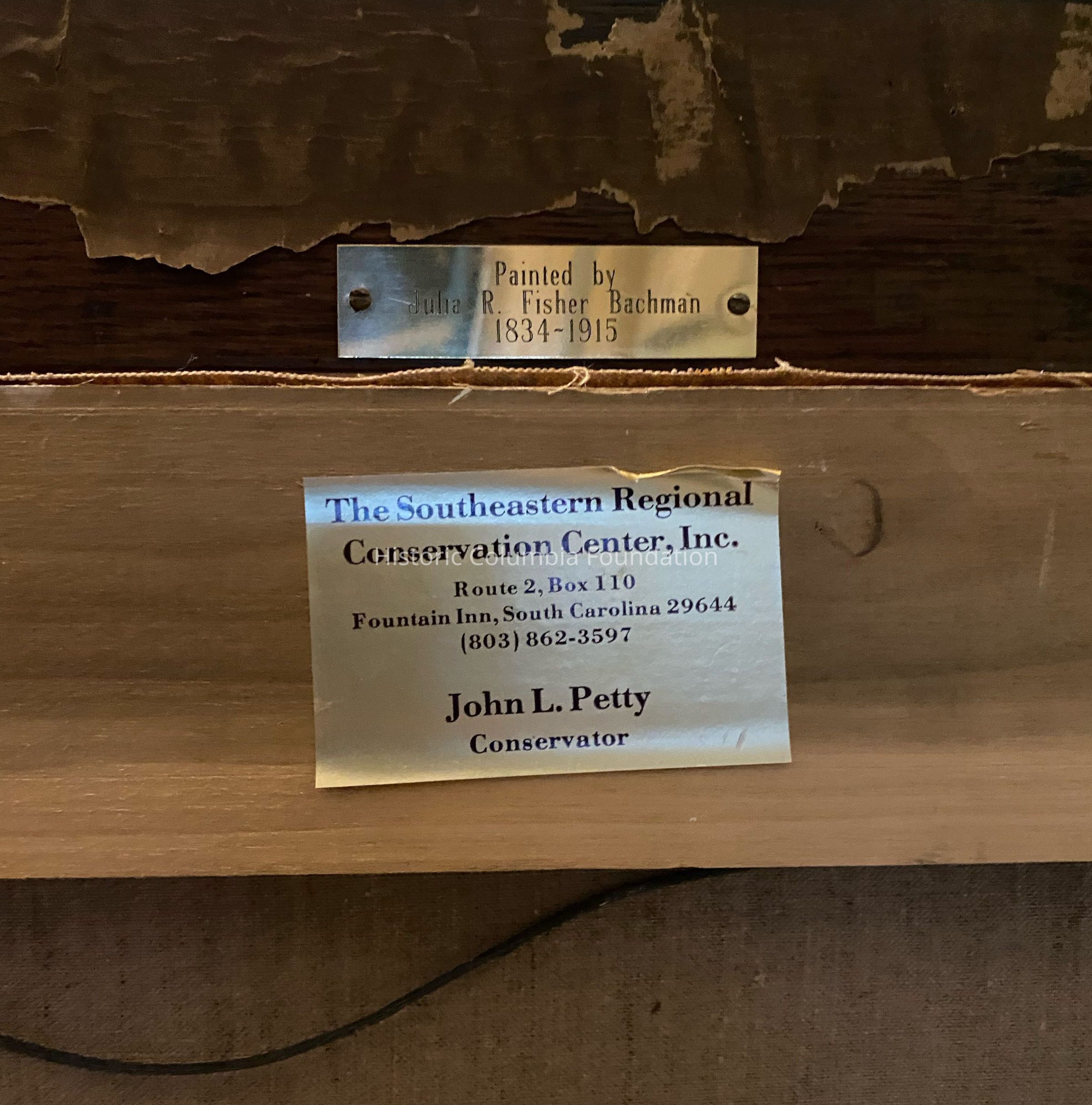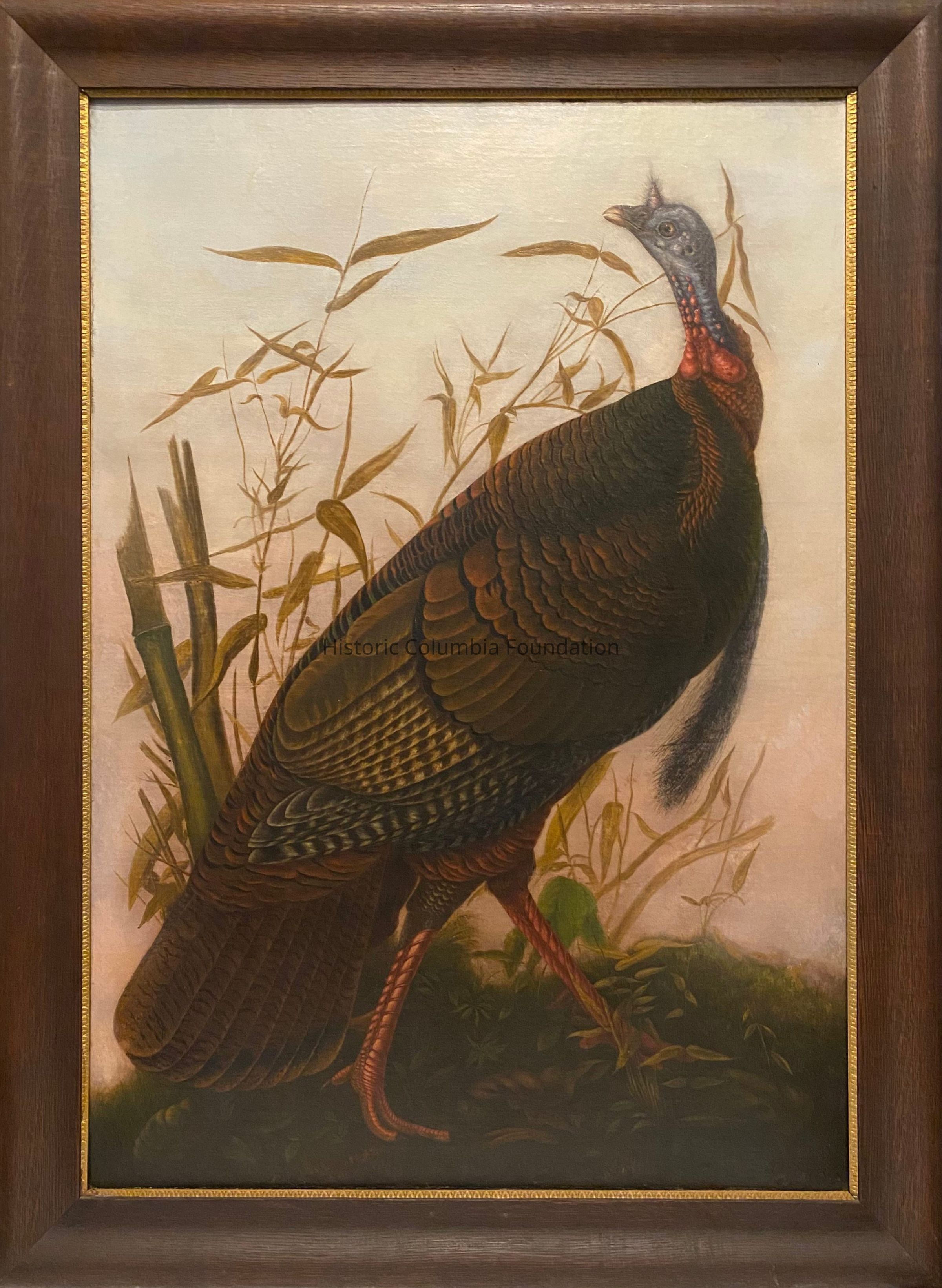 Columbia native Julia Rush Fisher Bachman (1834-1915) painted this near replica of John James Audubon’s (1785-1851) “Wild Turkey,” notable for being the first illustration in his seminal work The Birds of America. To complete The Birds of America and several other works, Audubon partnered with Julia’s father-in-law, John Bachman (1790-1874), who performed ornithological research, and her step-mother-in-law, Maria Martin (1796-1863), who drafted the background illustrations for many of Audubon’s drawings. Julia likely translated the “Wild Turkey” engraving into oil while living in the Fisher-Bachman House on Hampton Street with her husband, William K. Bachman (1830-1901), and her in-laws sometime before the Civil War.Dimensions