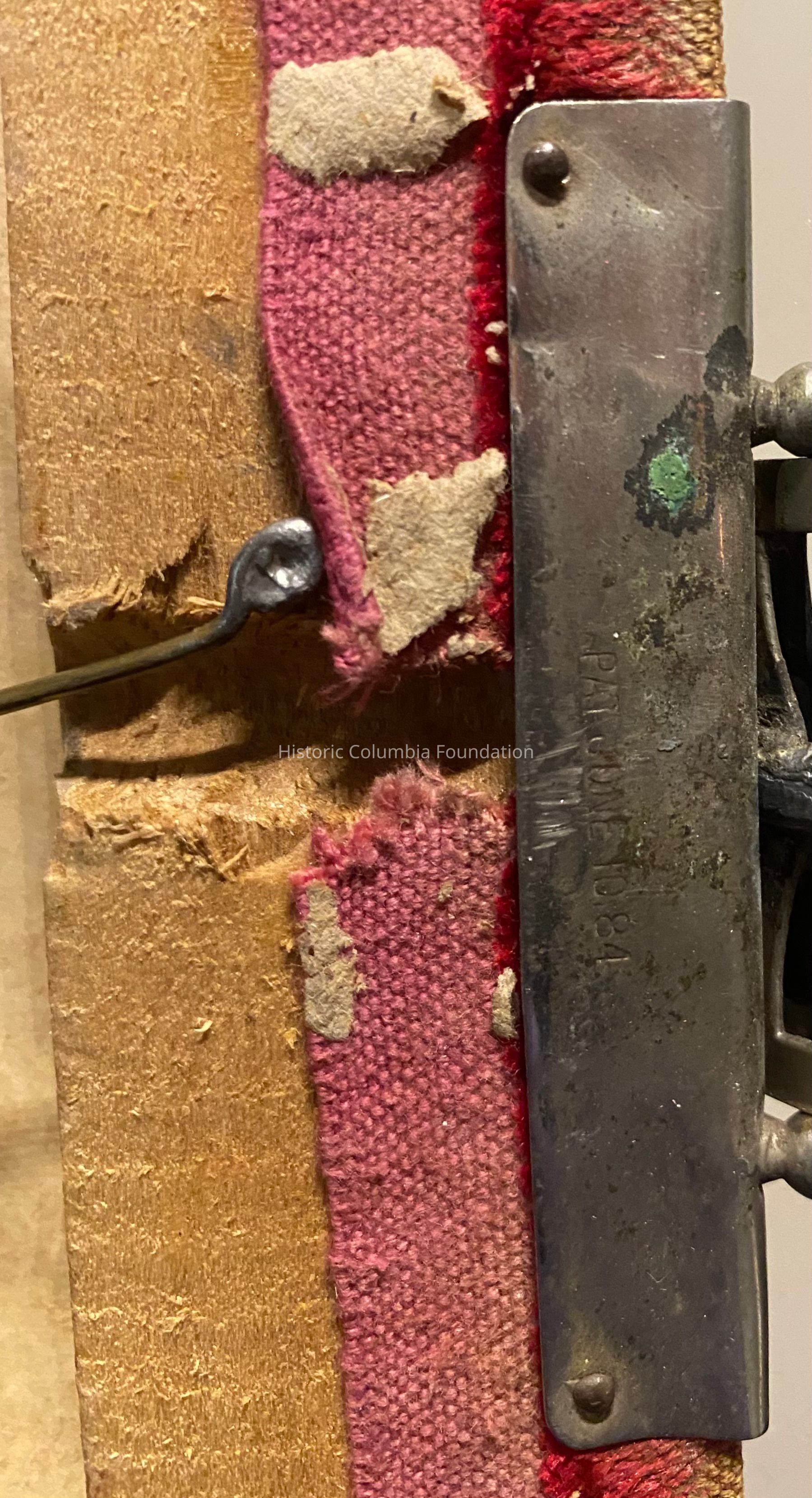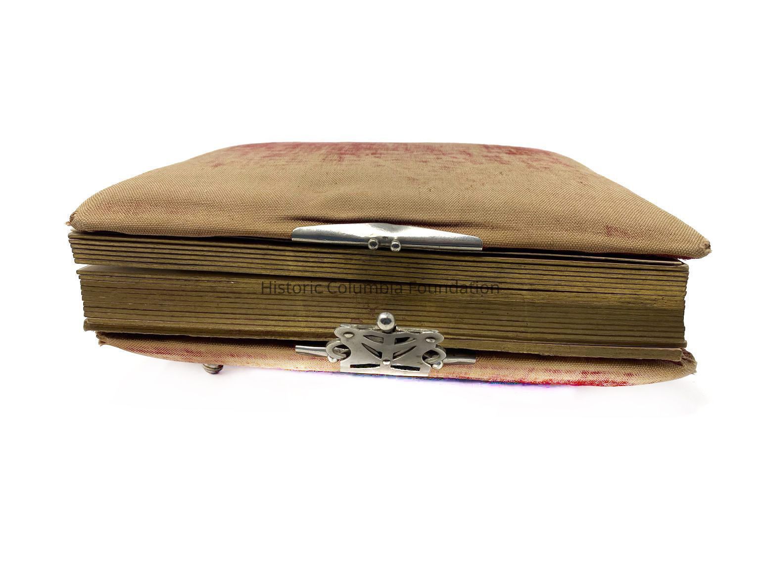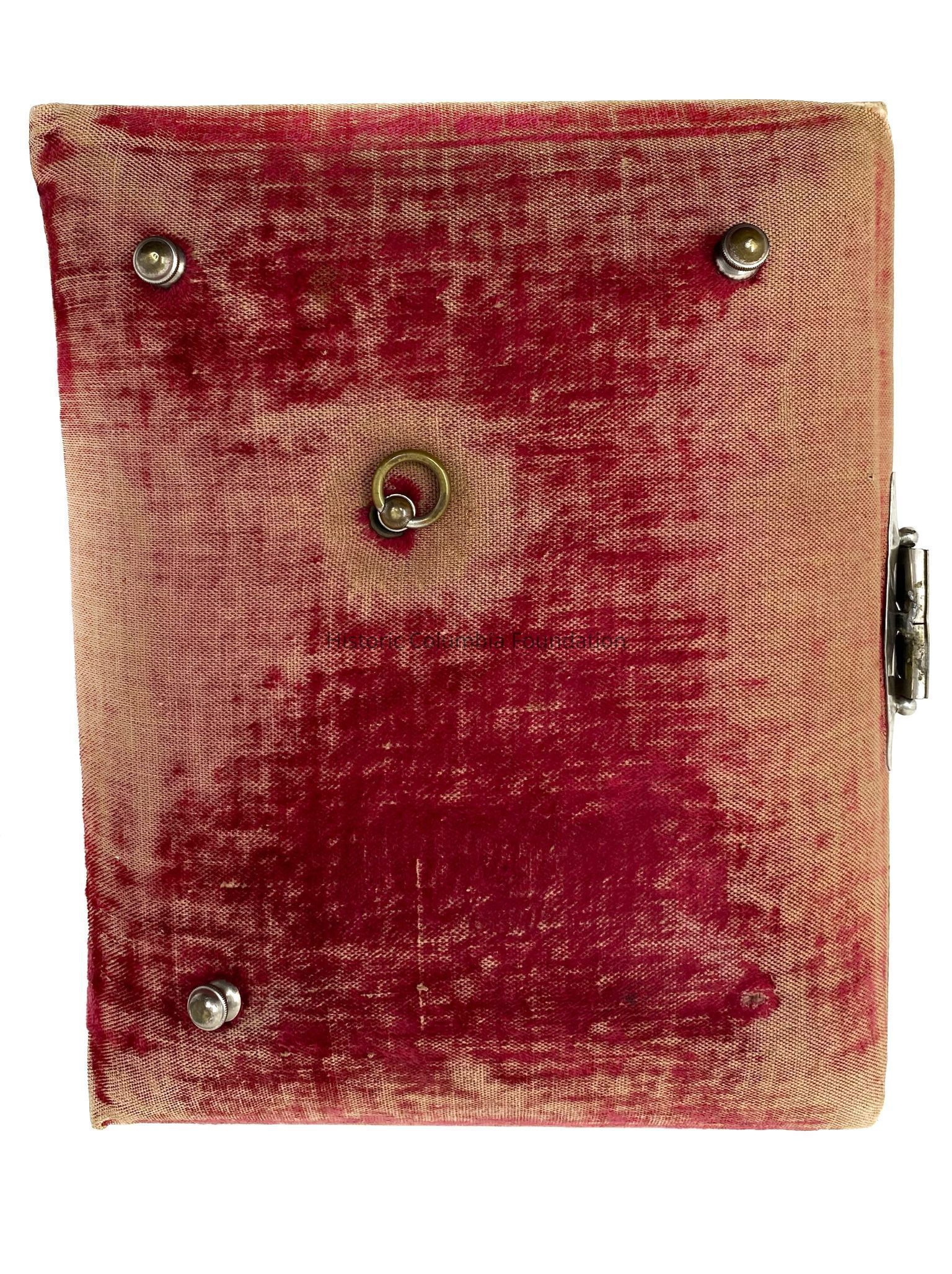 Faded red velvet family album with photos. The album is held together with a silver clasp, and it rests on four metal feet. There is a music box inside back cover. The album contains twenty-four (24) Wilson and Woodrow family members' photographs, and the name "James Hamilton Woodrow, 1869-1892" is written under the first slot for a photograph.Context