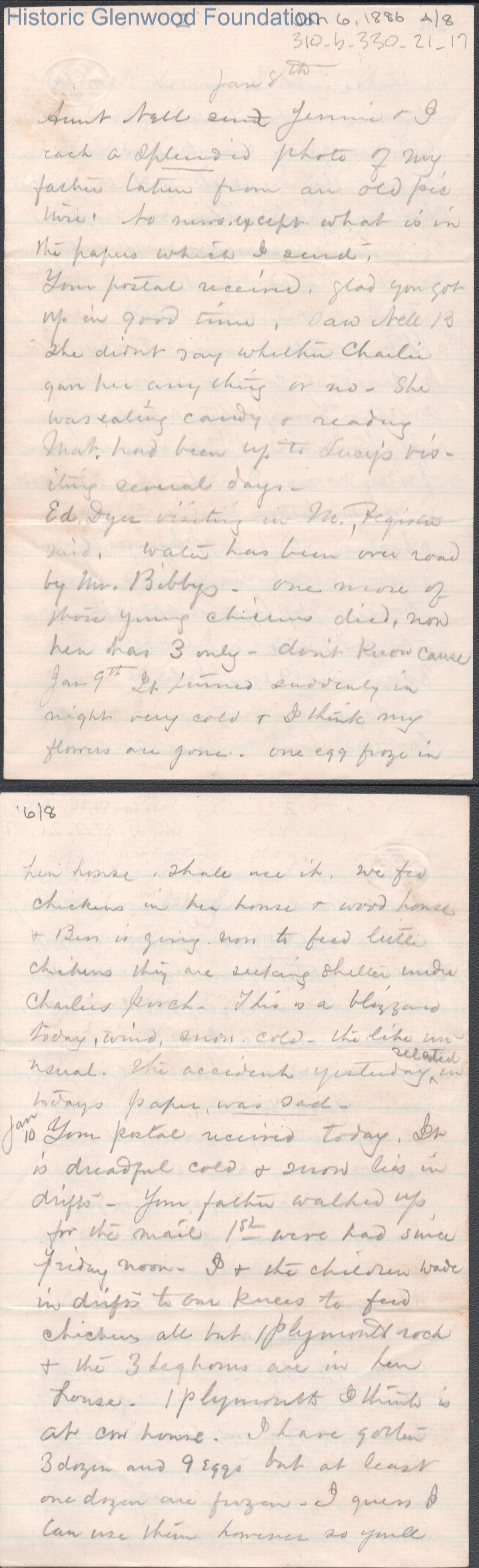 Eight-page letter to George W. Summers from his mother Lucy W. Summers, Jan 6, 1886.