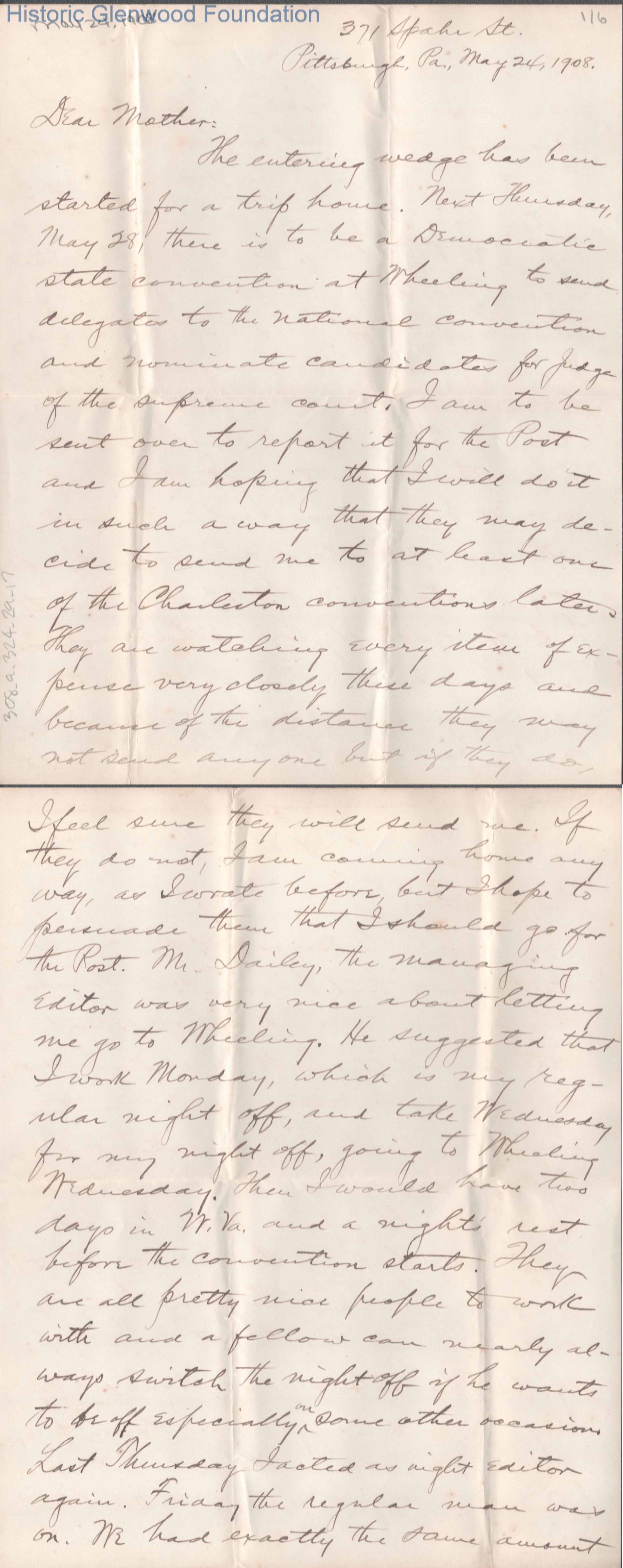 Six-page letter to Lucy W. Summers from son George W. Summers, May 24, 1908.
