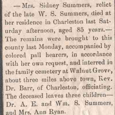 Sydney Lucy Summers Summers, obituary, two versions, Oct. 6, 1883