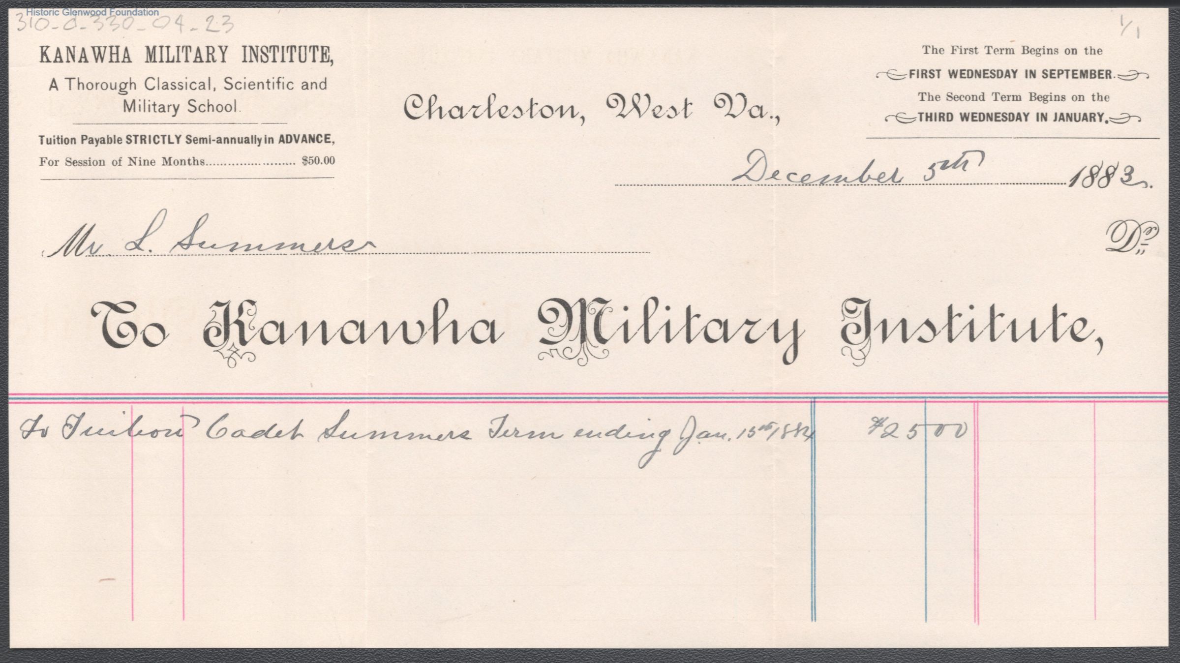 George W. Summers, Tuition Statement, Kanawha Military Institute, Dec 5, 1883