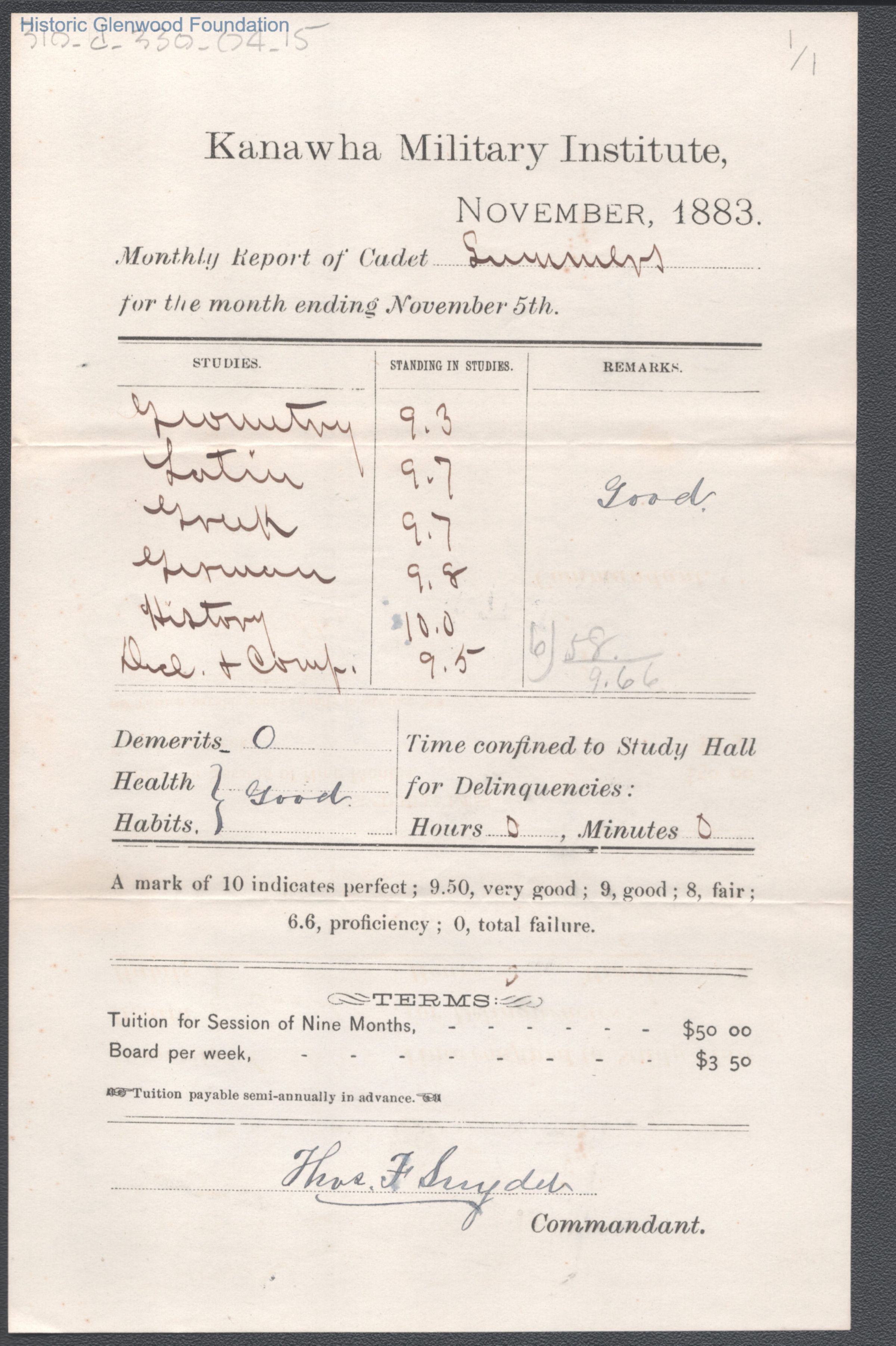 George W. Summers Progress Report, Kanawha Military Institute, Nov 5, 1883.