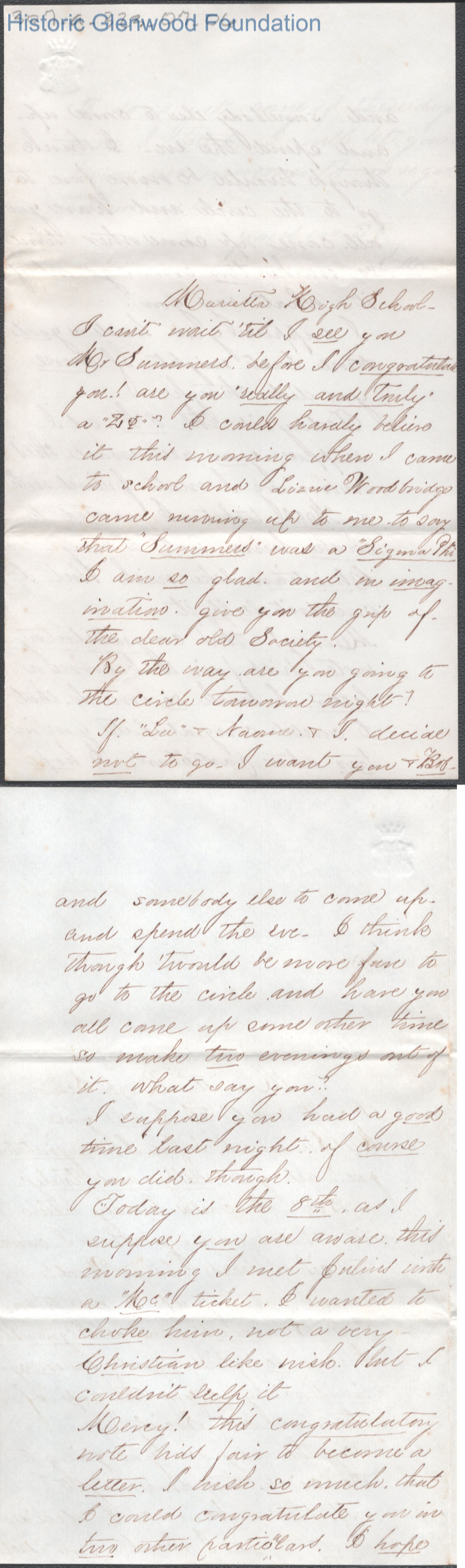 Three-page letter to Lewis Summers from Marietta classmate "Ella", c. 1864.