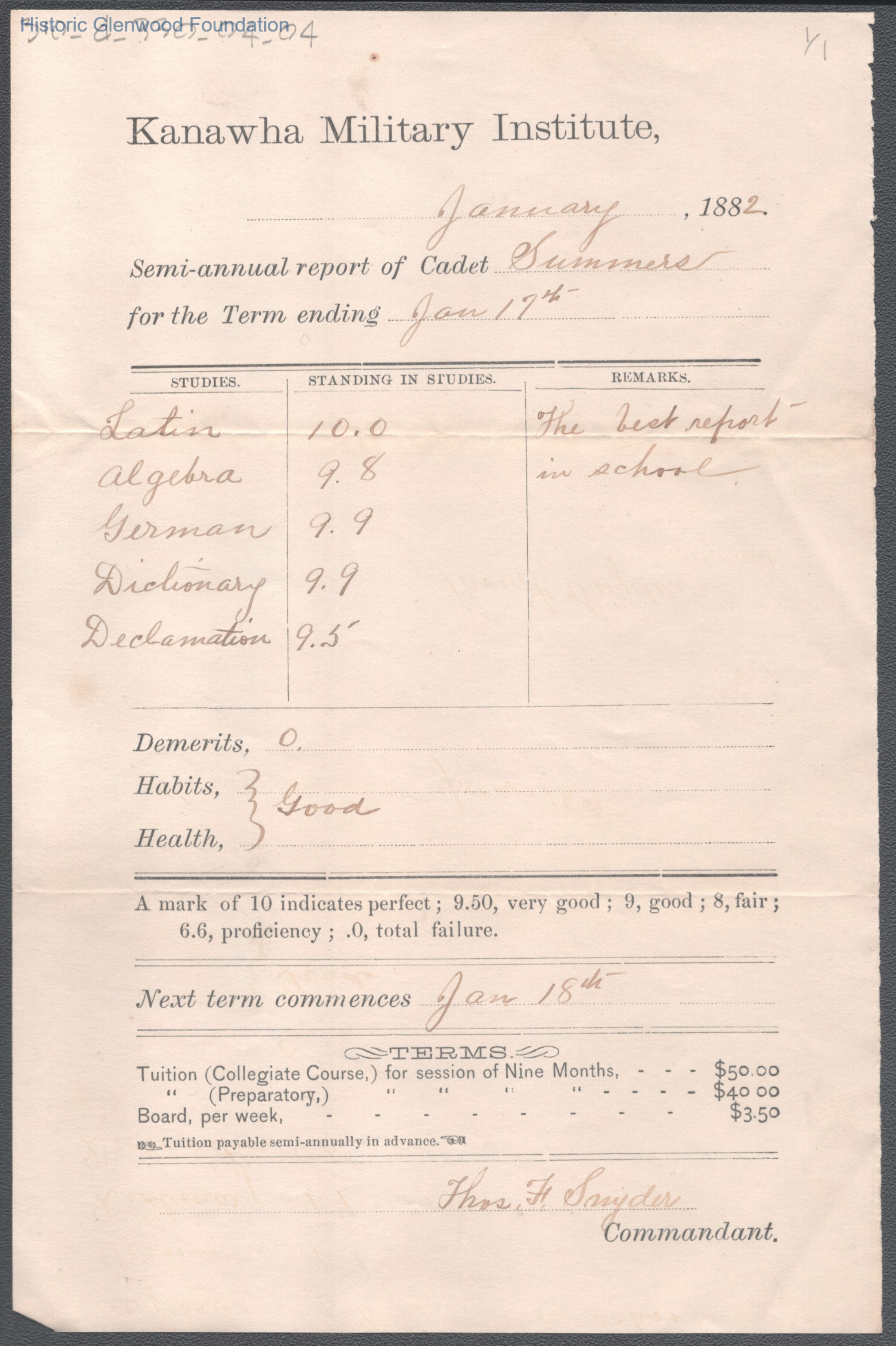 George W. Summers Progress Report, Kanawha Military Institute, Jan 17, 1882.