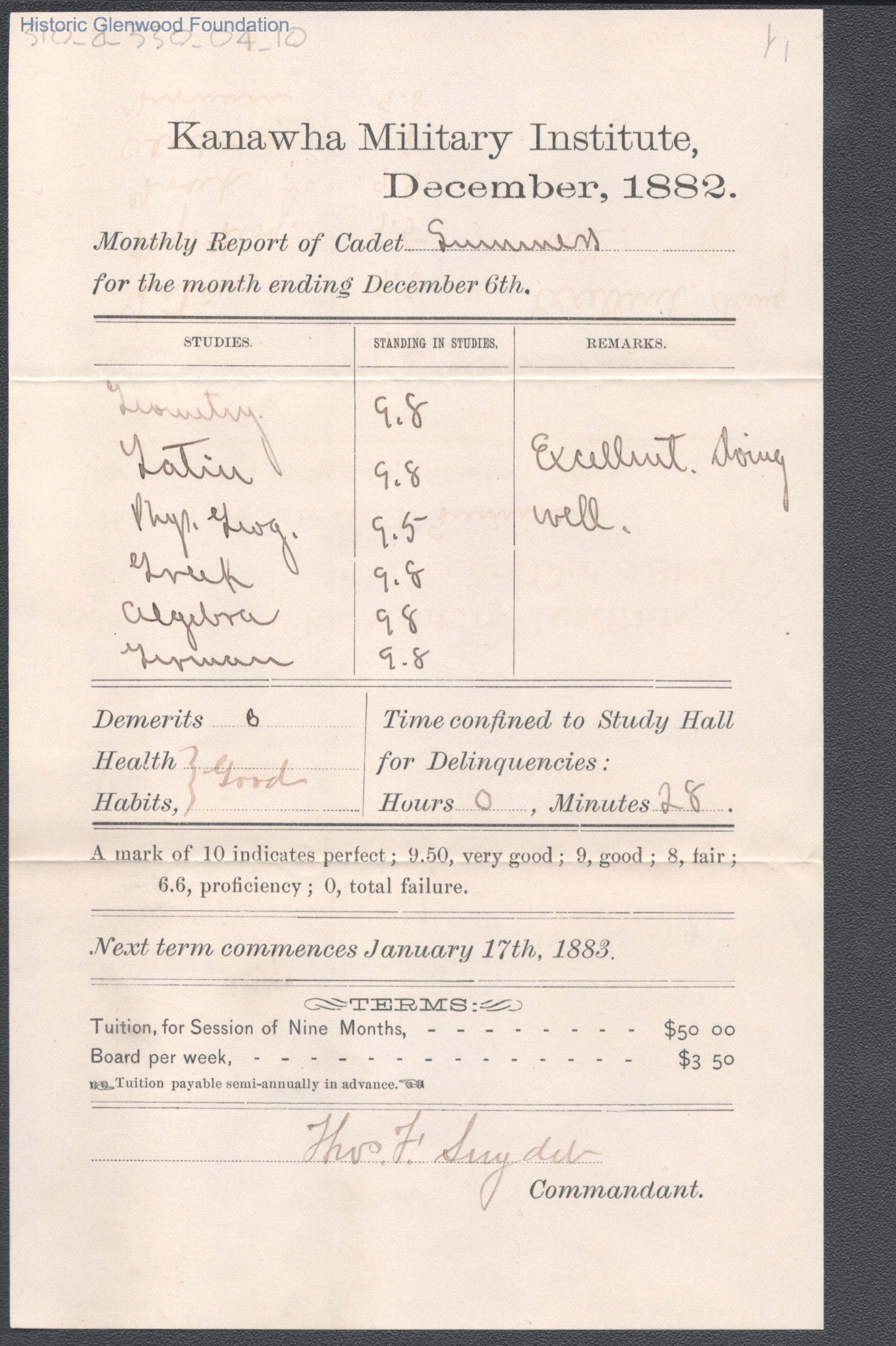 George W. Summers Progress Report, Kanawha Military Institute, Dec 6, 1882.