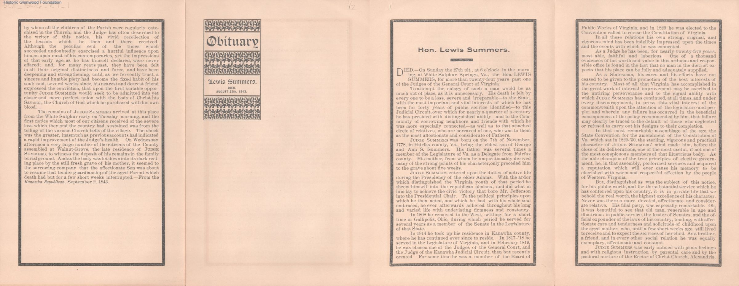 Four-page obituary for Judge Lewis Summers, who died Aug 27, 1843.