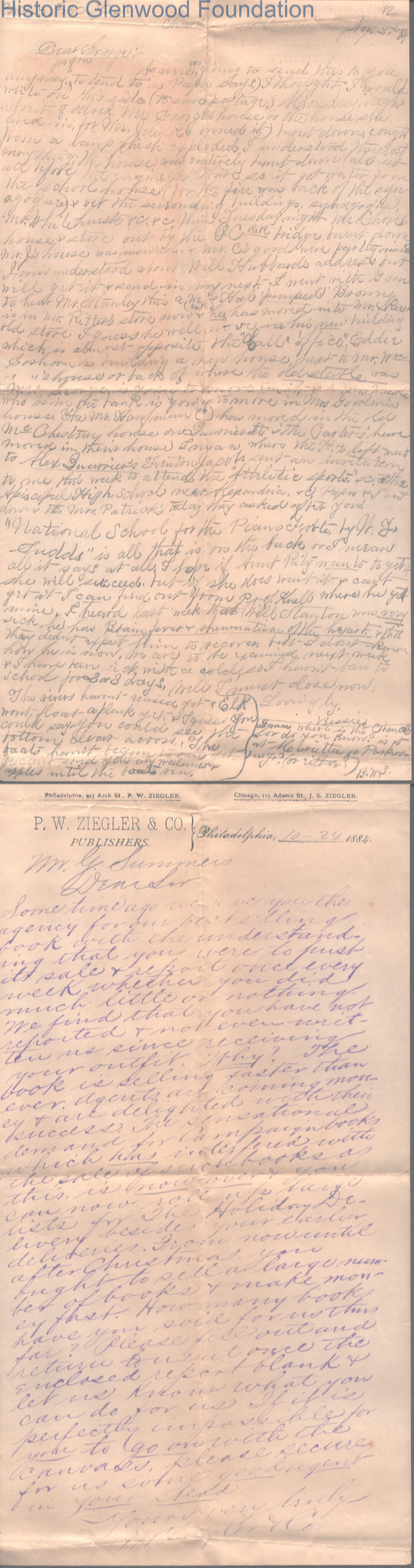 Single page letter to George W. Summers from his sister Elizabeth S. Quarrier, Nov 2, 1884. Includes enclosure from P. W. Ziegler & Sons.