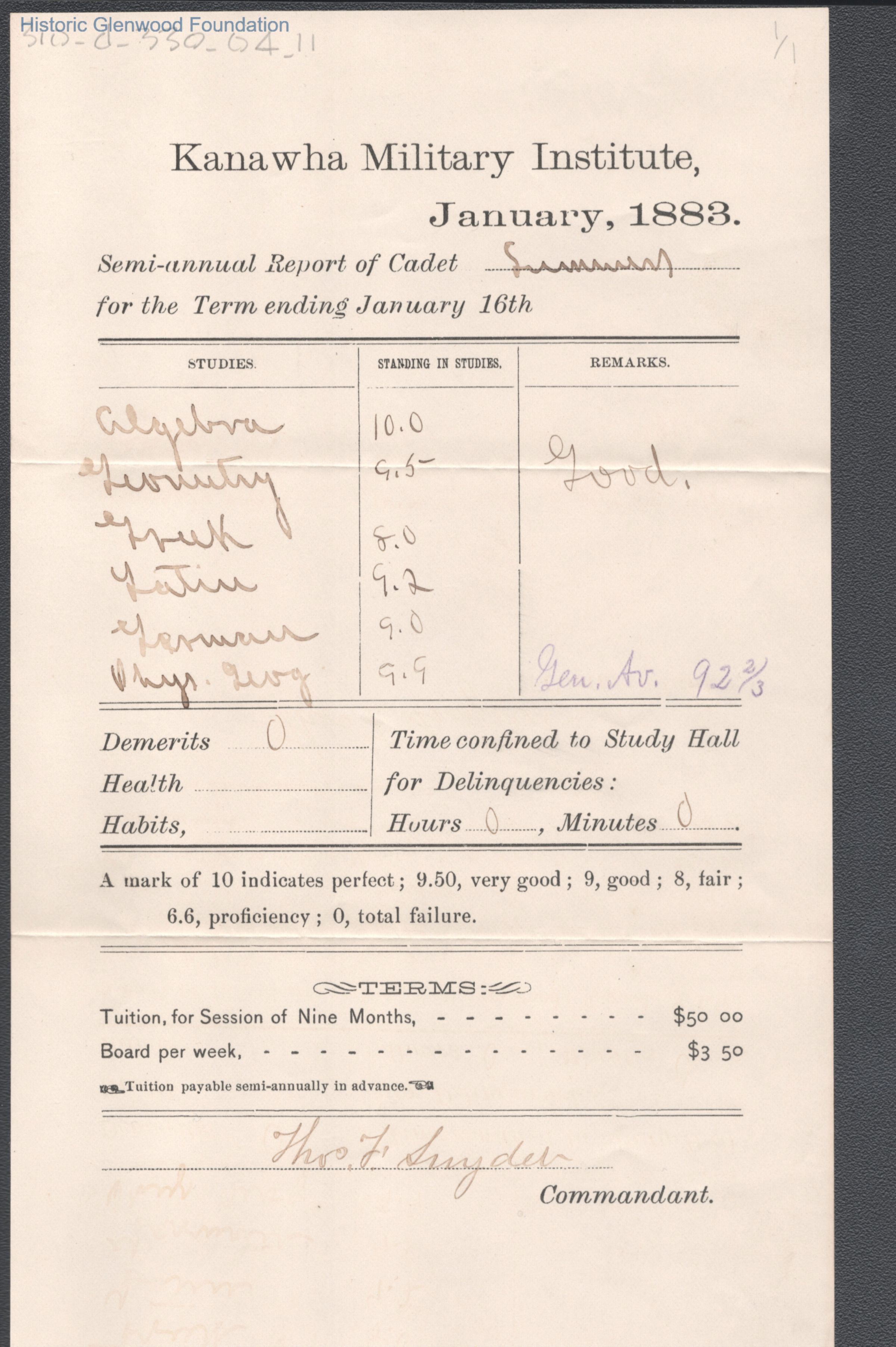 George W. Summers Progress Report, Kanawha Military Institute, Jan 16, 1883.