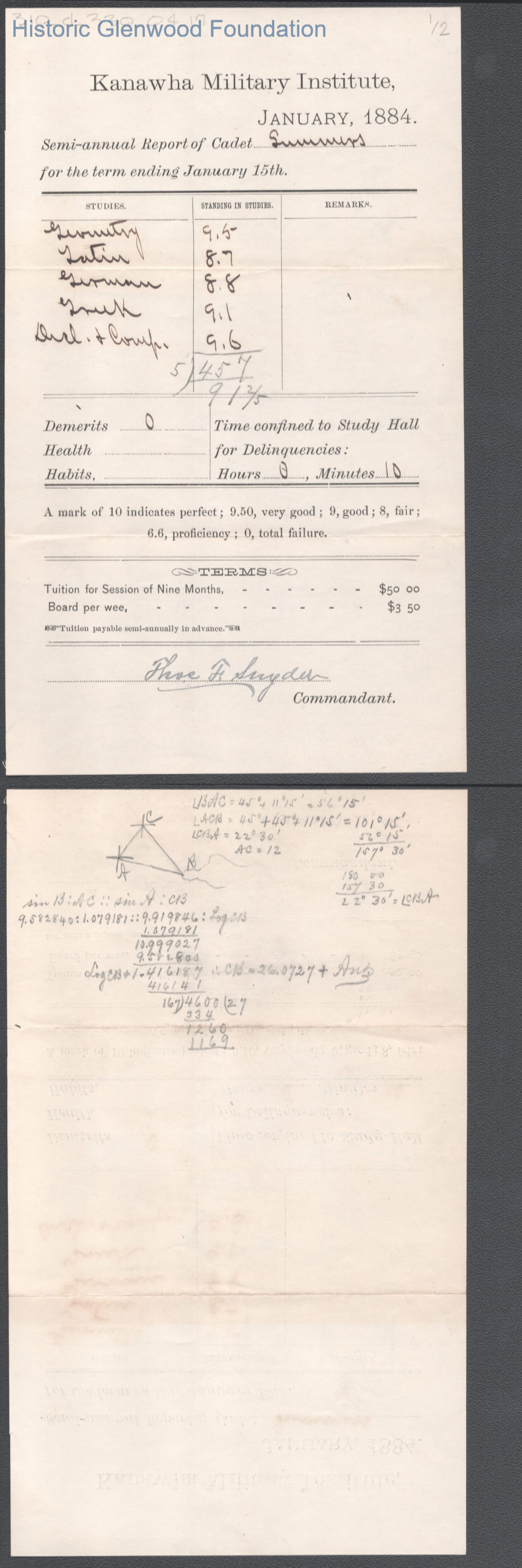 George W. Summers Progress Report, Kanawha Military Institute, Jan 15, 1884.