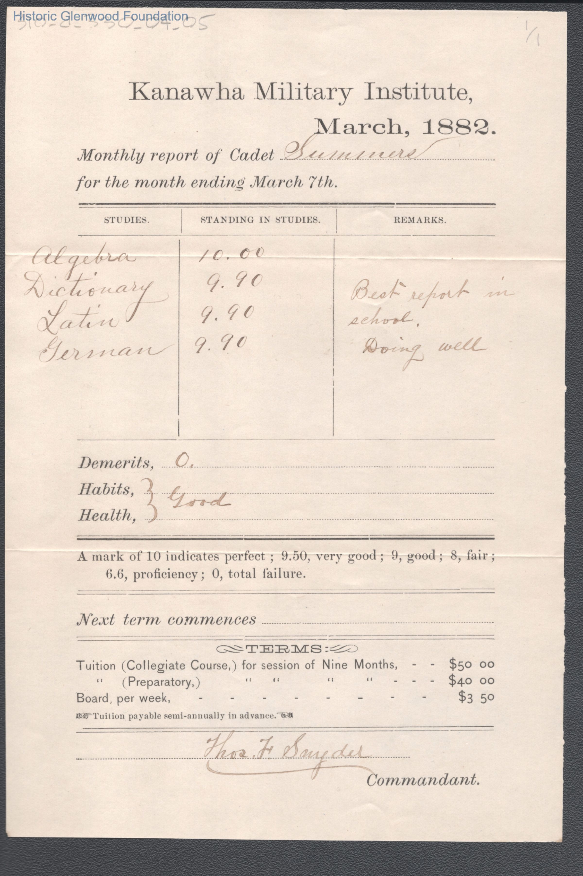 George W. Summers Progress Report, Kanawha Military Institute, Mar 7, 1882.