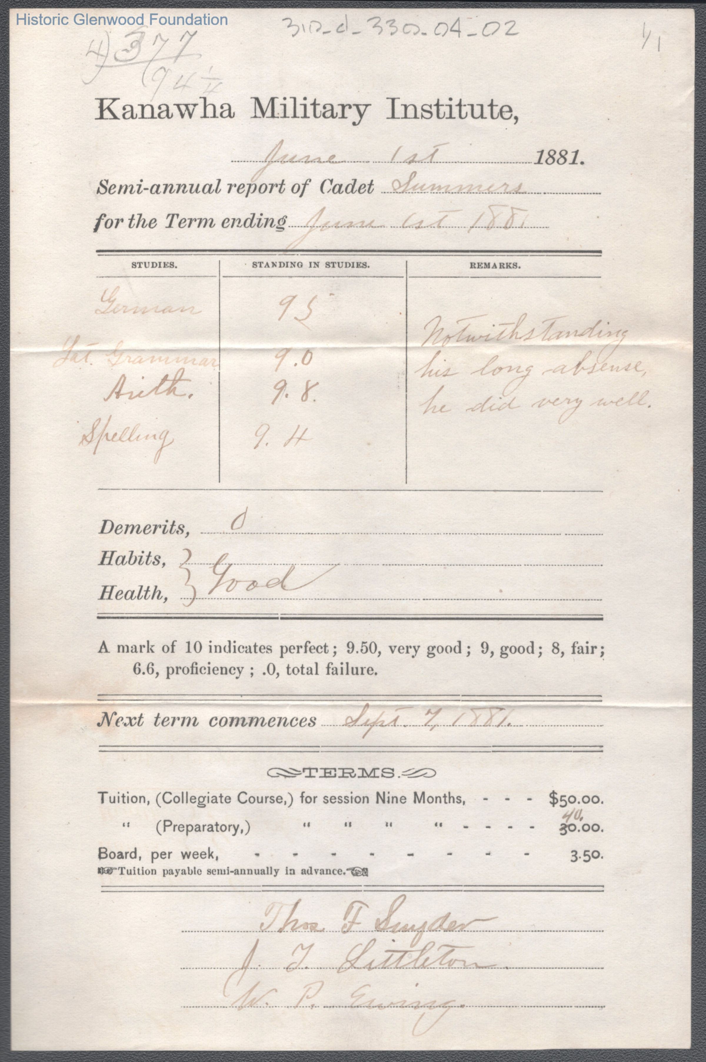 George W. Summers, Progress Report, Kanawha Military Institute, Jun 1, 1881