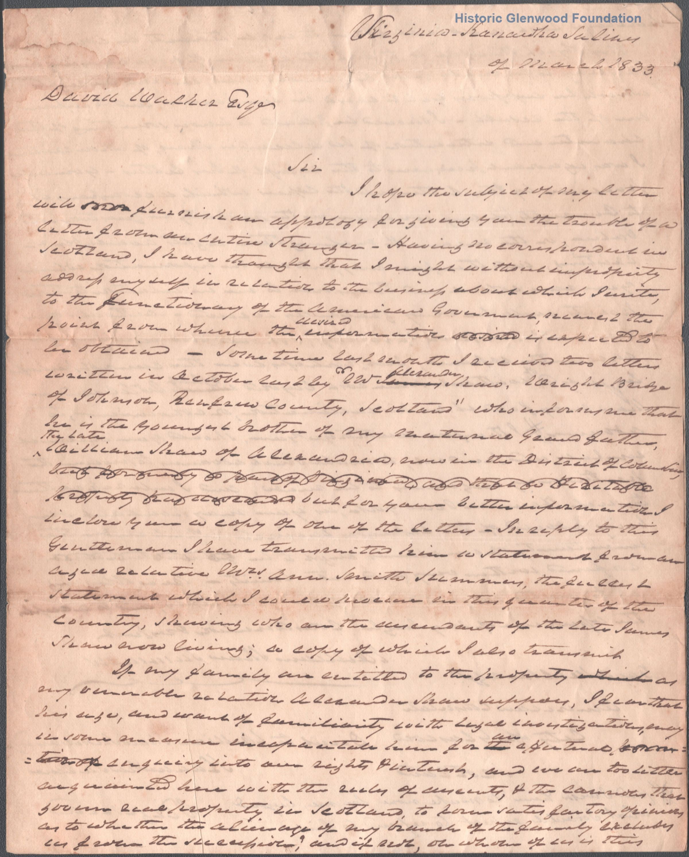William Shaw Summers to David Walker, March 1833