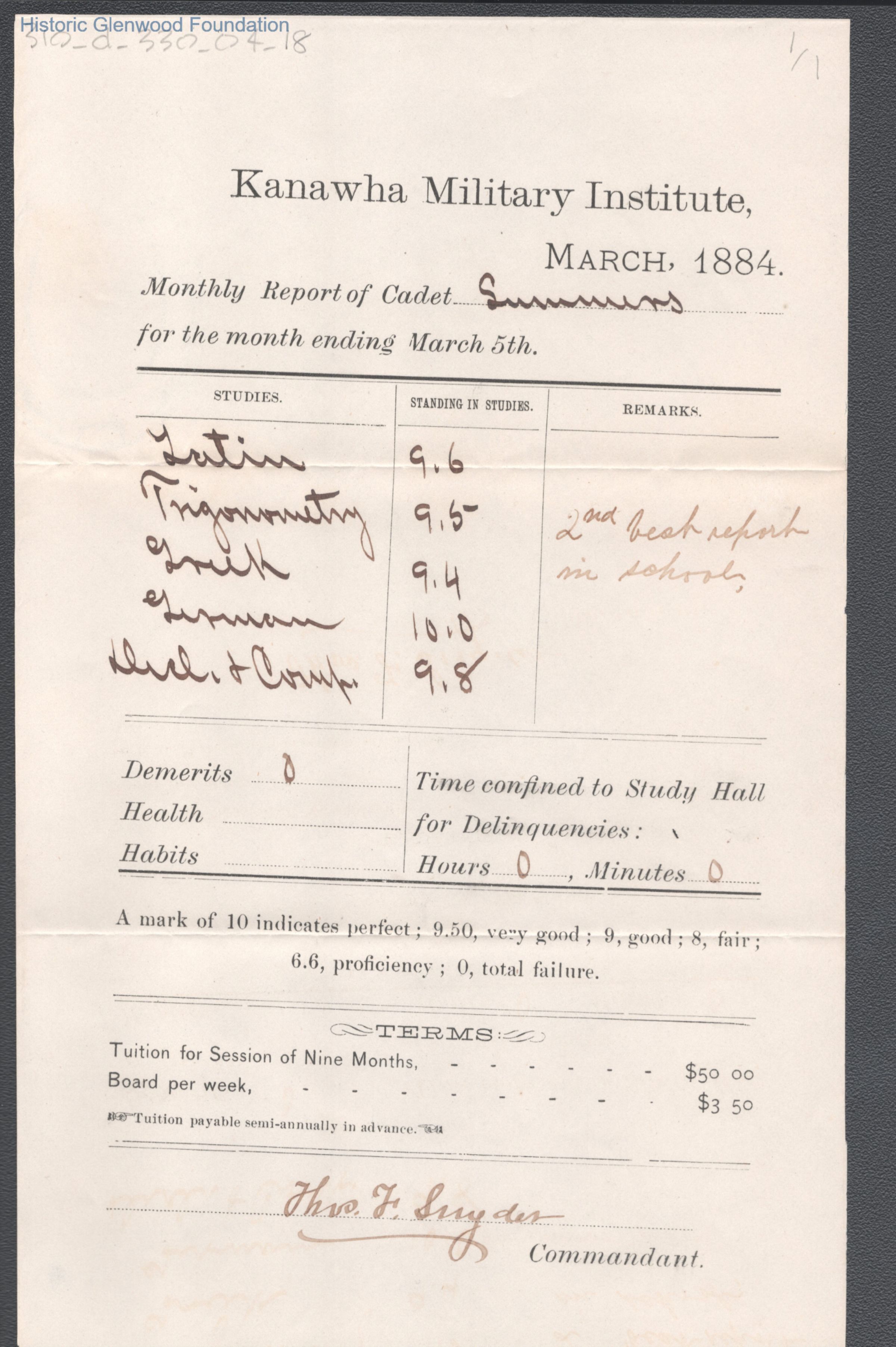 George W. Summers Progress Report, Kanawha Military Institute, Mar 5, 1884.
