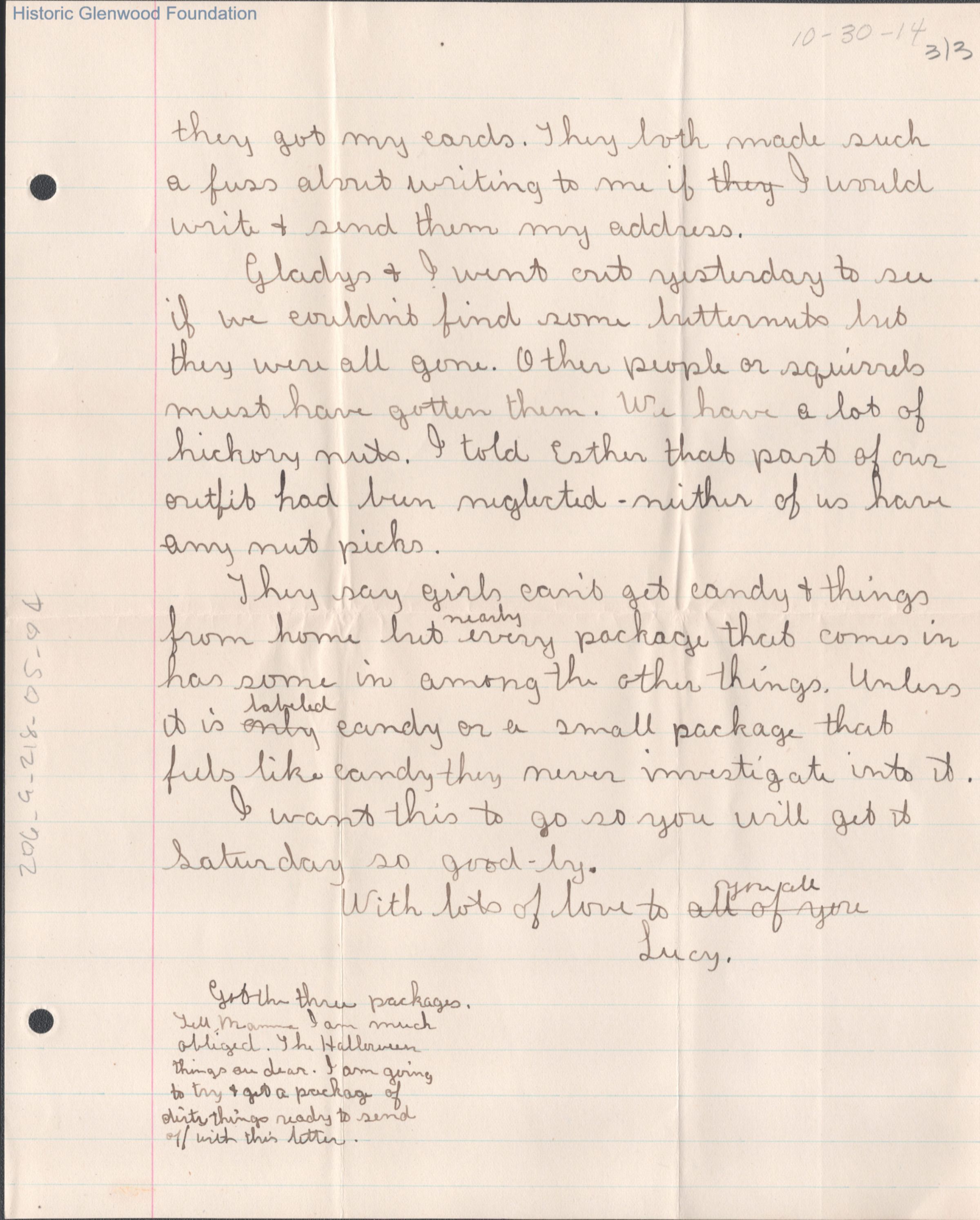 Three-page letter to Alexander W. Quarrier from Lucy S. Quarrier, Oct 30, 1914.
