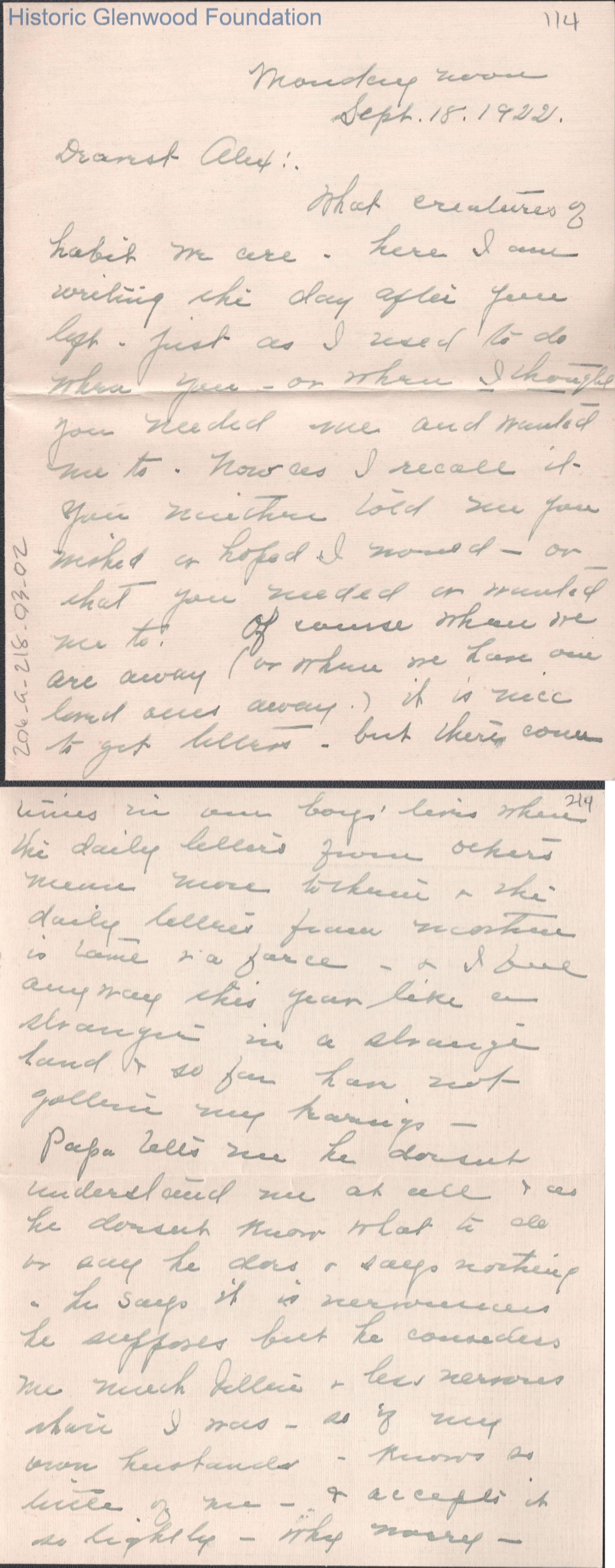 Four-page letter to Alexander W. Quarrier from mother Elizabeth S. Quarrier, Sep 18, 1922.