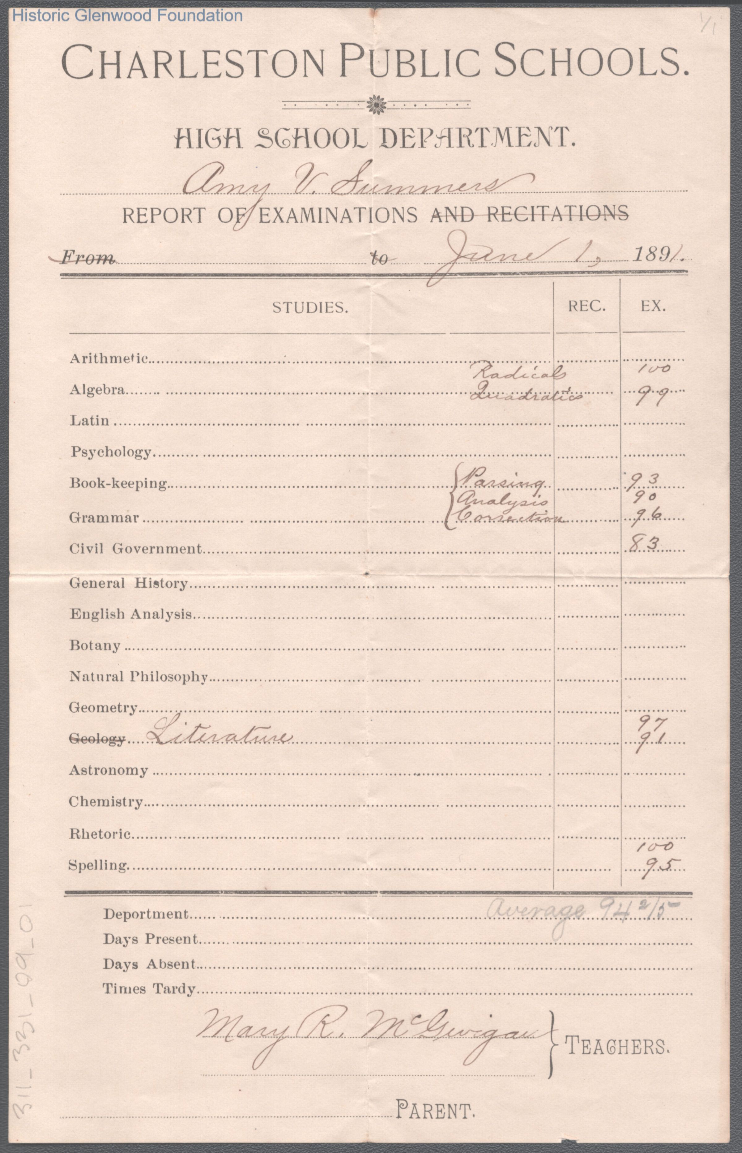 Amacetta "Amy" Summers' Progress Report, Charleston High School, Jun 1, 1891