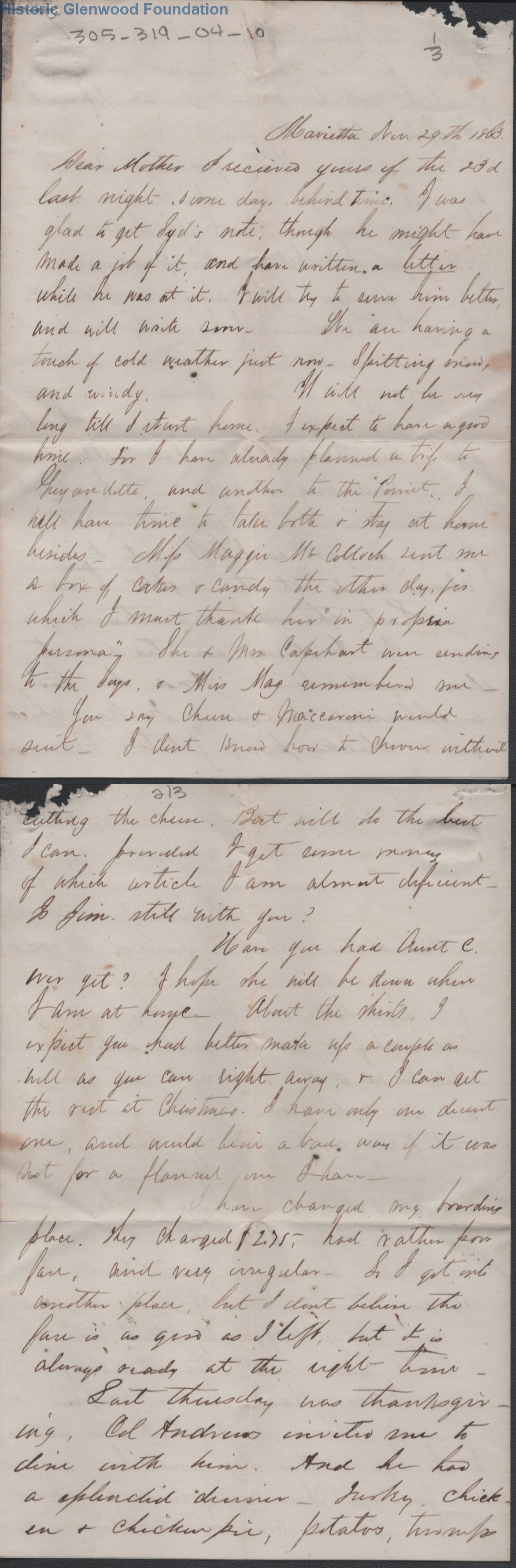 Three page letter to Amacetta L. Summers from her son, Lewis Summers