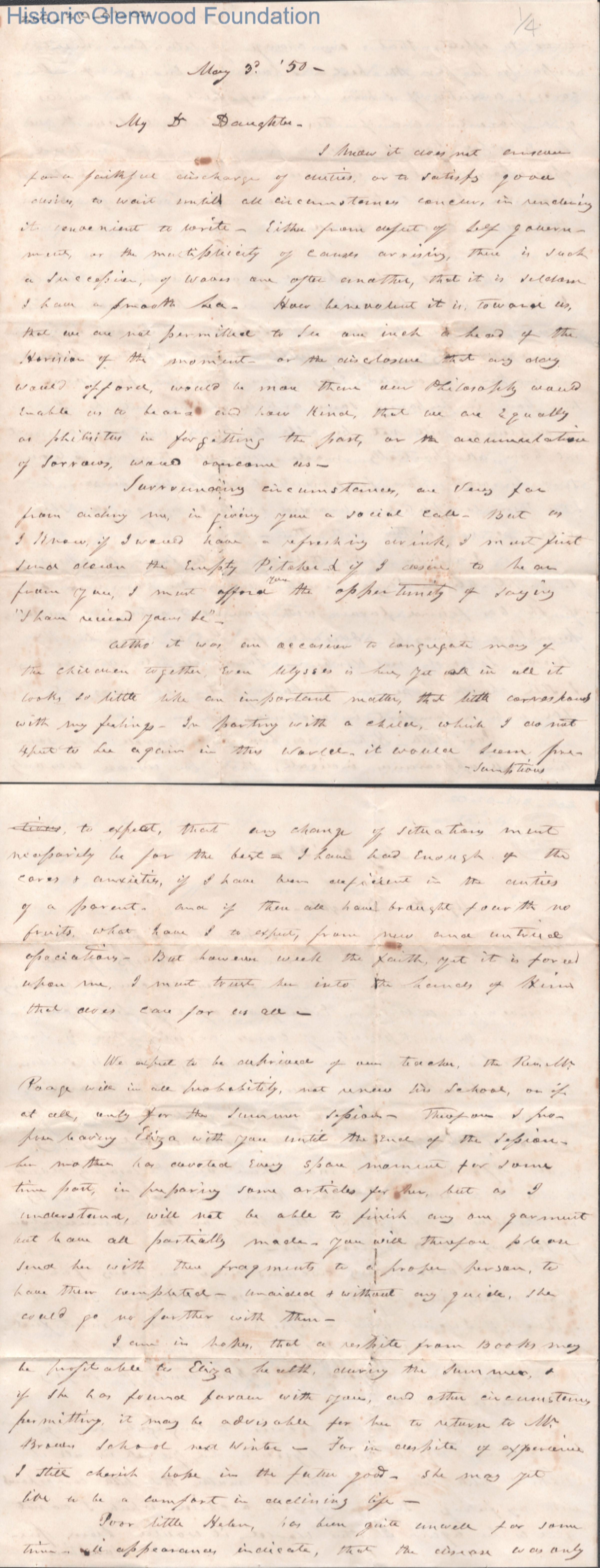 Four-page letter to Amacetta Laidley Summers from her father John O. Laidley, May 3, 1850.