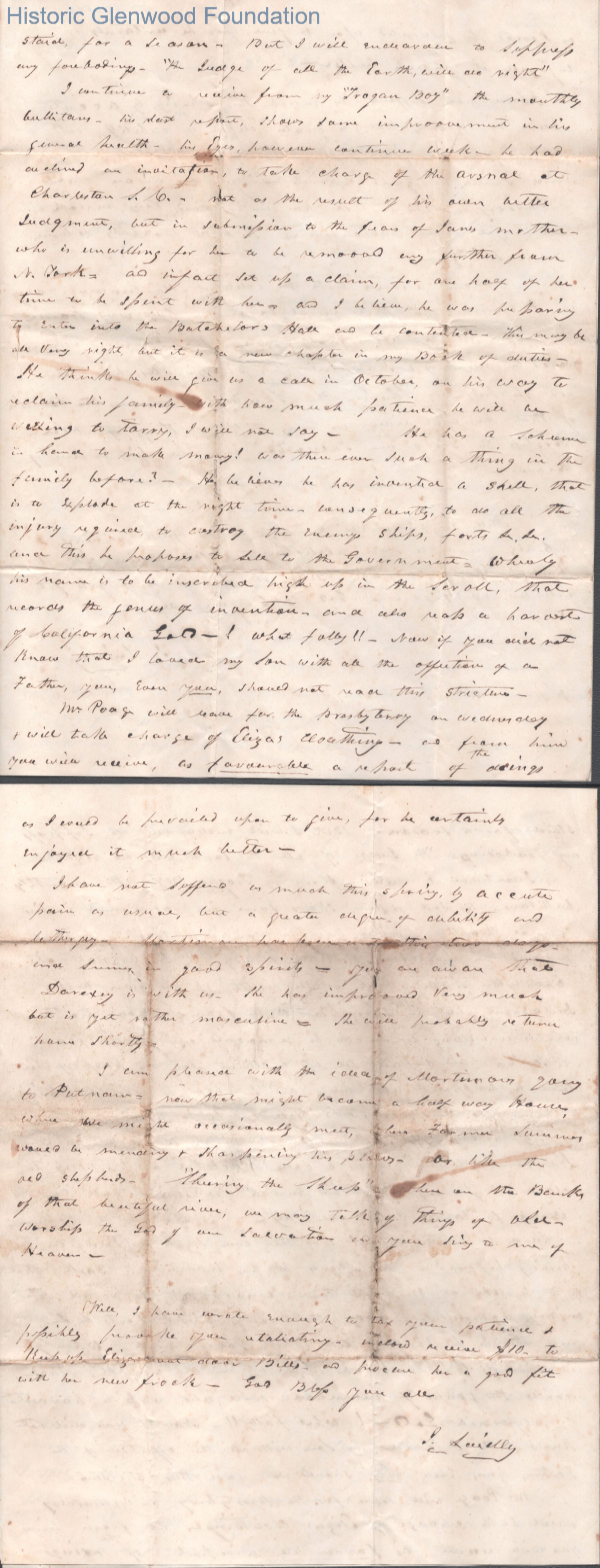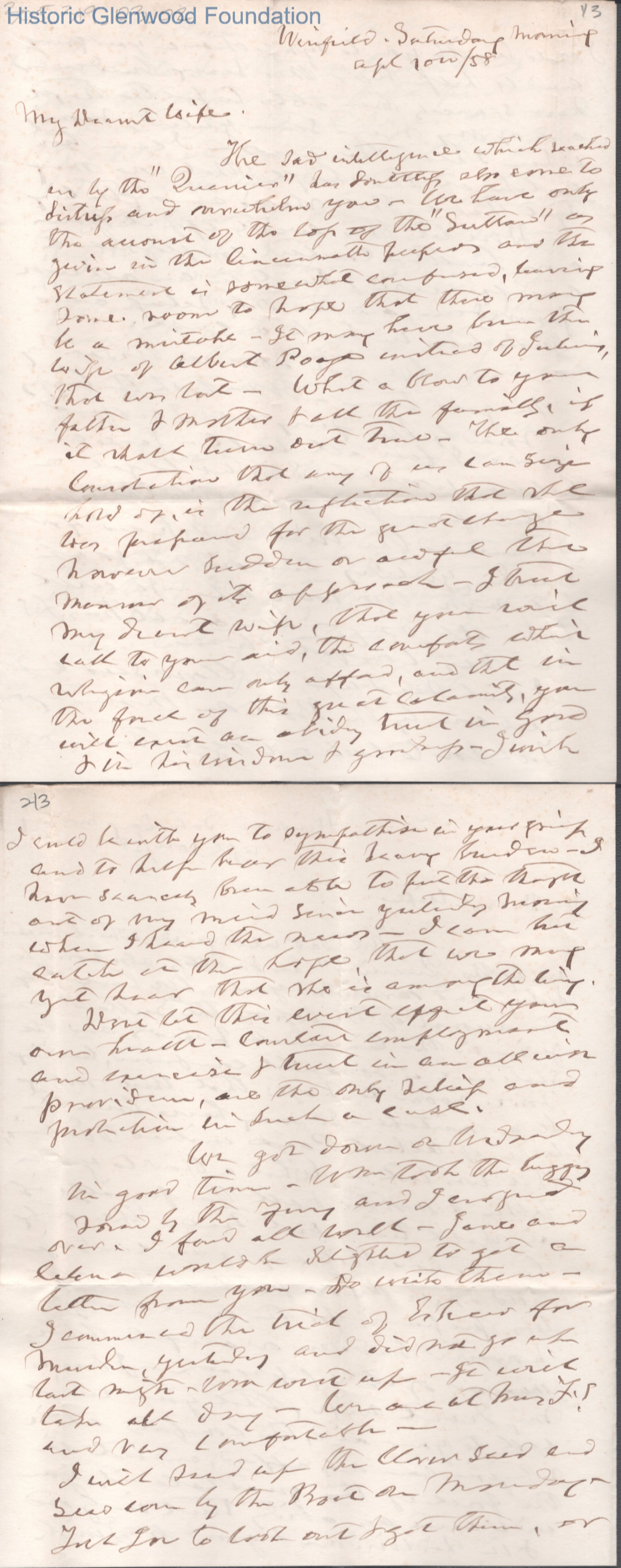 Four-page letter to Amacetta Laidley Summers from husband Judge George Summers, Apr 10, 1858.