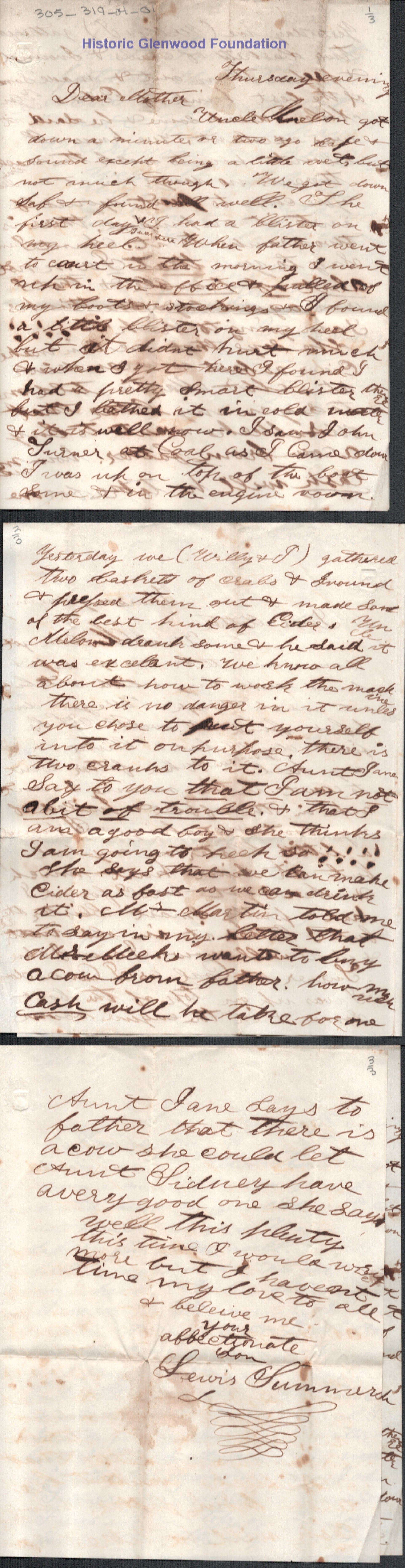 3 pg letter to Amacetta L. Summers from son Lewis Summers