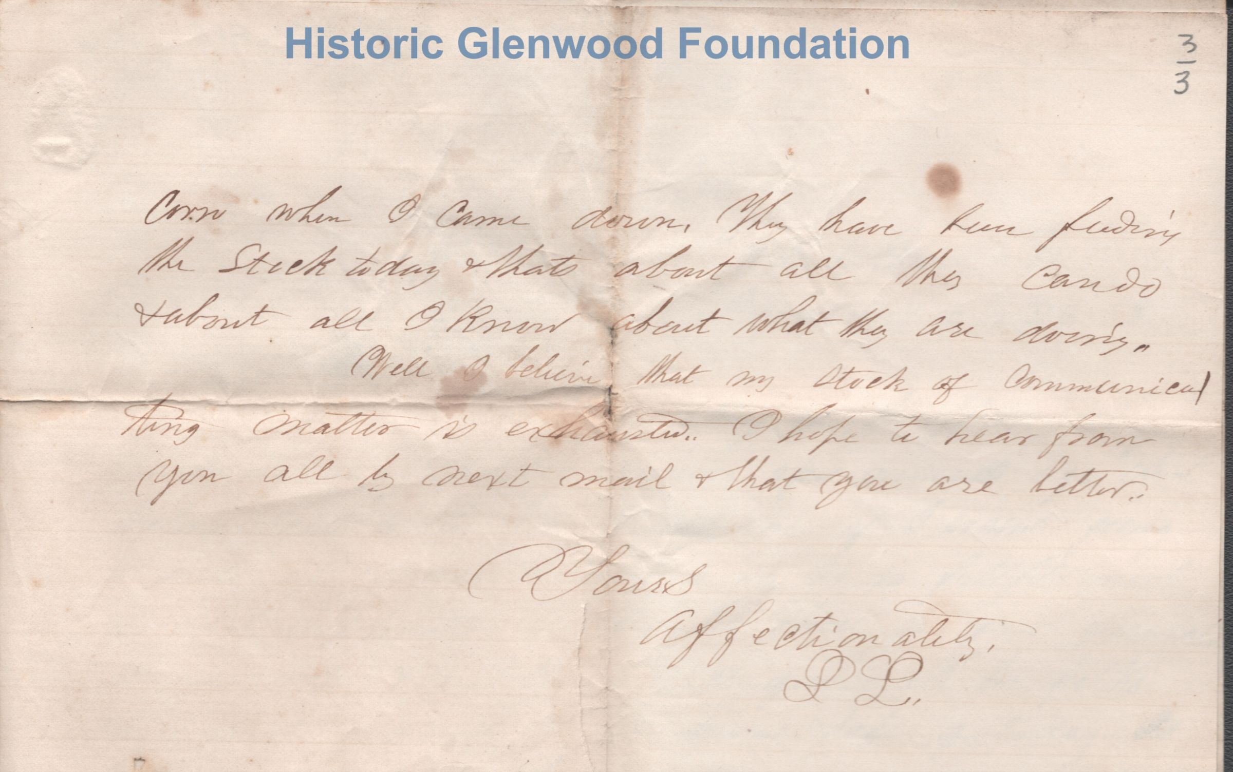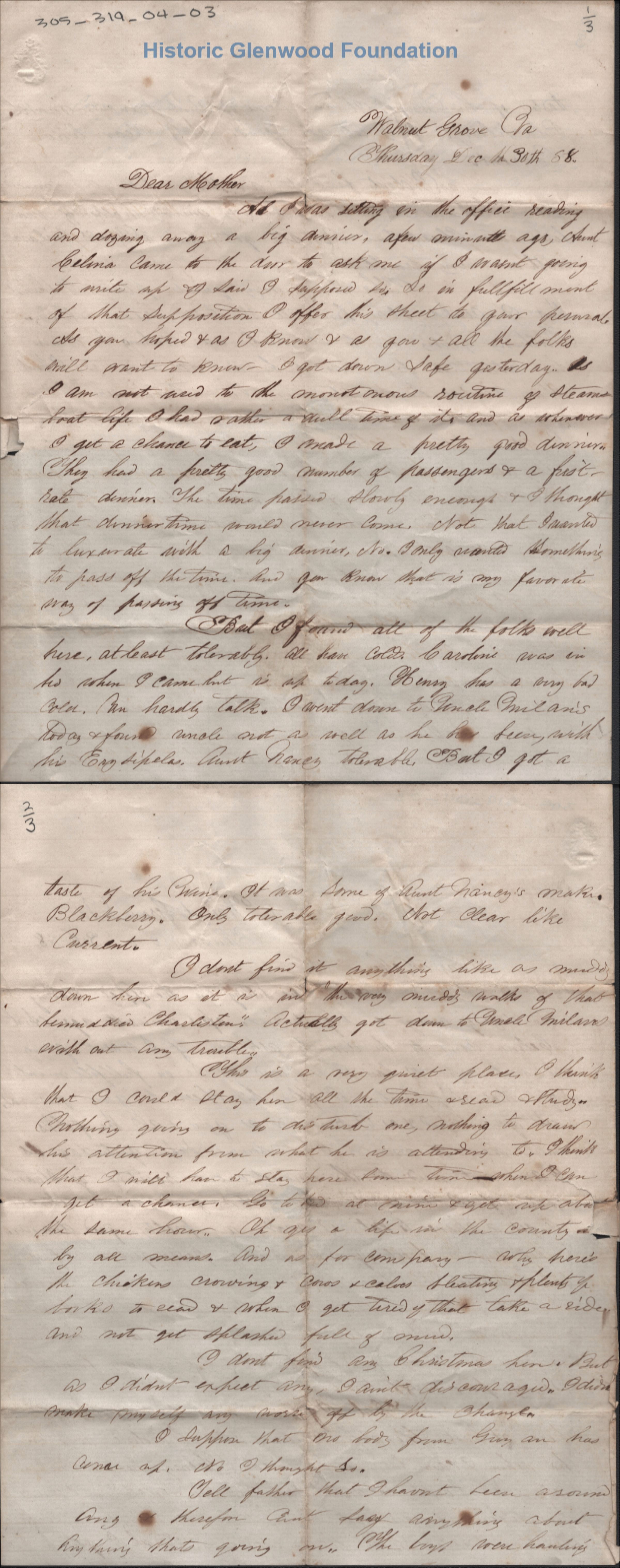 2 1/2 pg letter to Amacetta L Summers from son Lewis Summers while he was visiting Walnut Grove.