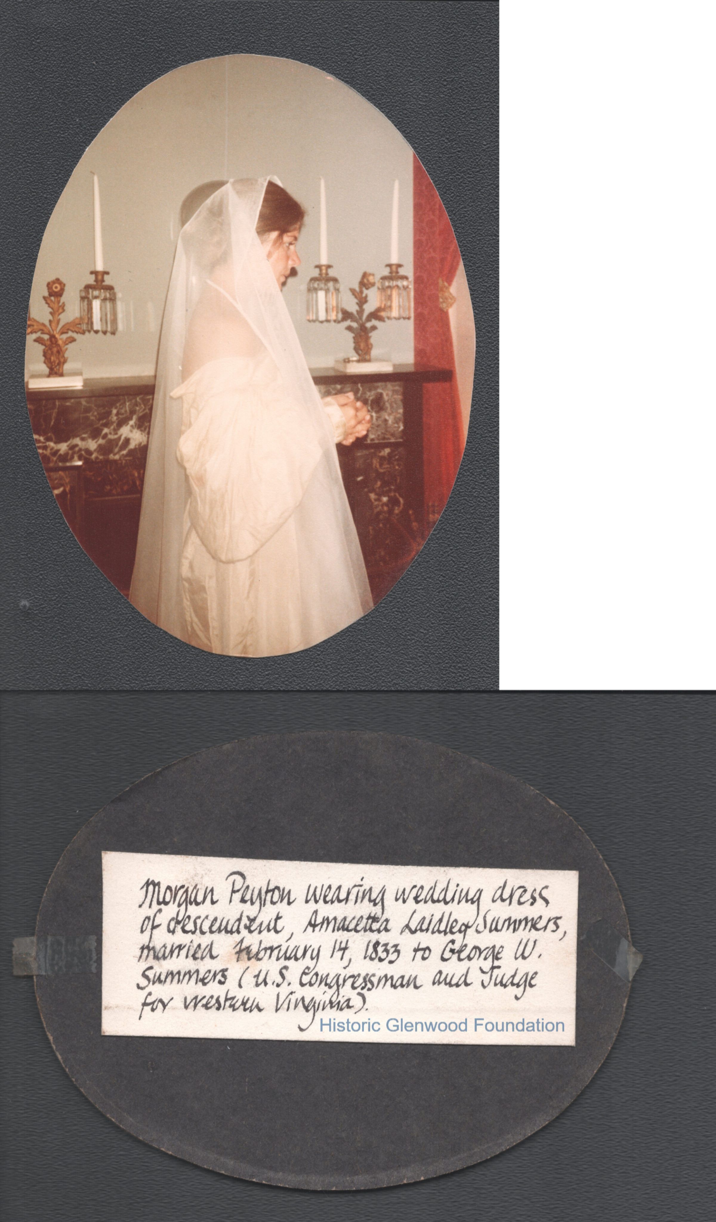 "Morgan Peyton wearing wedding dress of descendent, Amacetta Laidley Summers, married February 14, 1833 to George W. Summers (U. S. Congressman & Judge for western Virginia." [Amacetta was Ms. Peyton's ancestor, not descendent.]