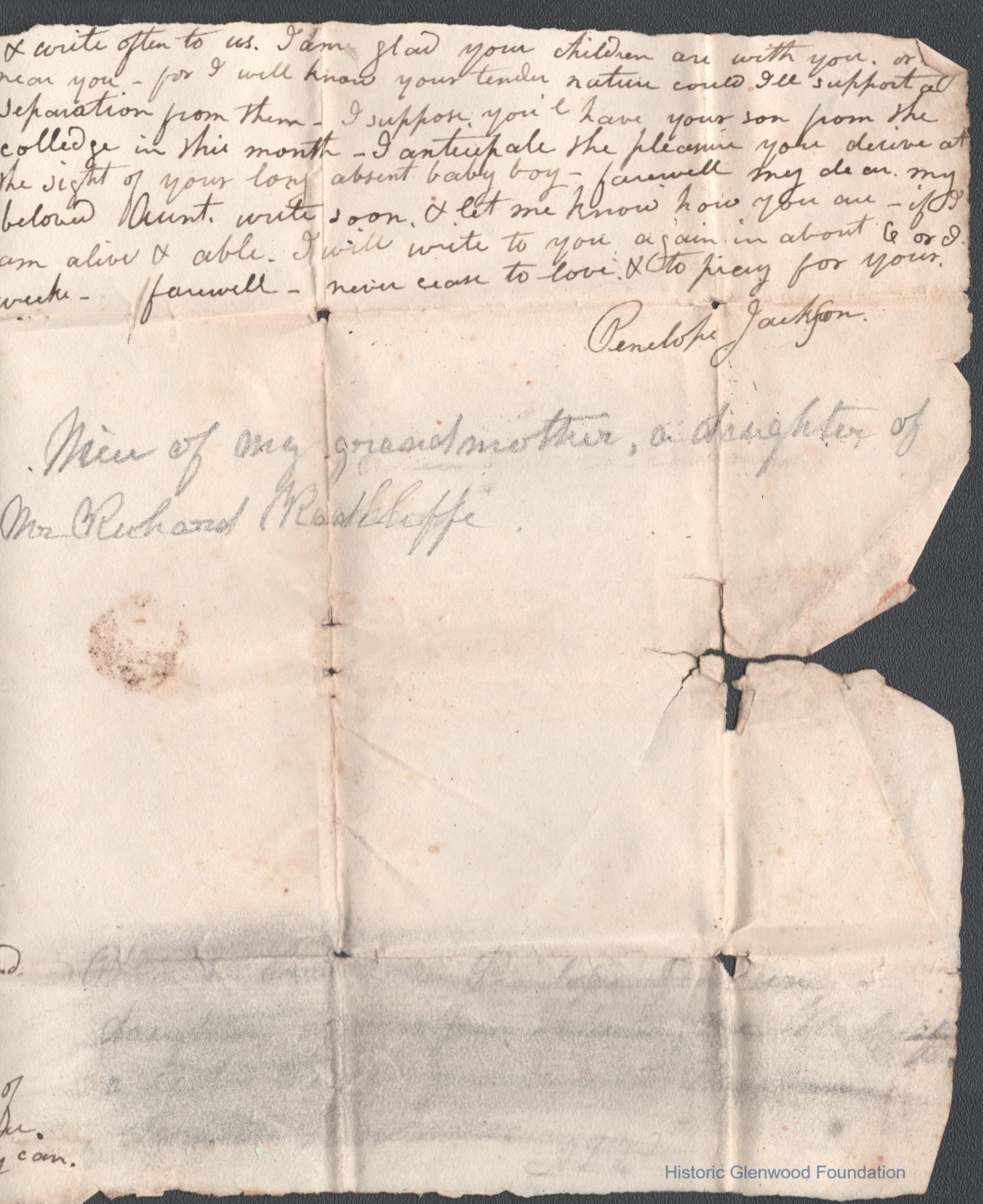 2 1/2 page handwritten letter to Ann "Nancy" Summers, 1821 from Penelope Jackson. Note added indicates that Penelope was the daughter of Richard RadcliffDate(s) of Creation