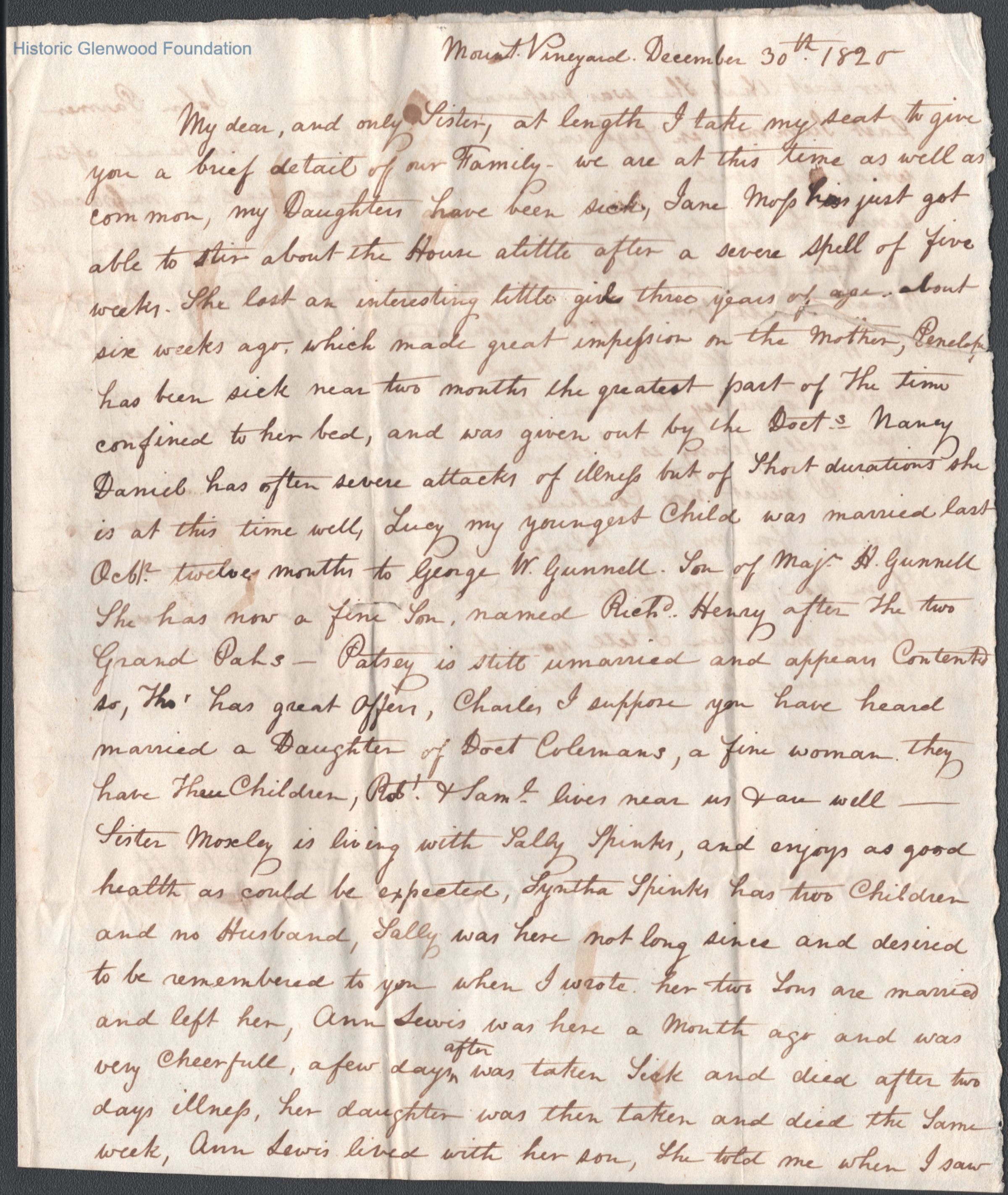 2-page handwritten letter to Ann "Nancy" Summers, dated 1825. Author identifies herself as "ever loving sister, Locian Ratcliff"Date(s) of Creation