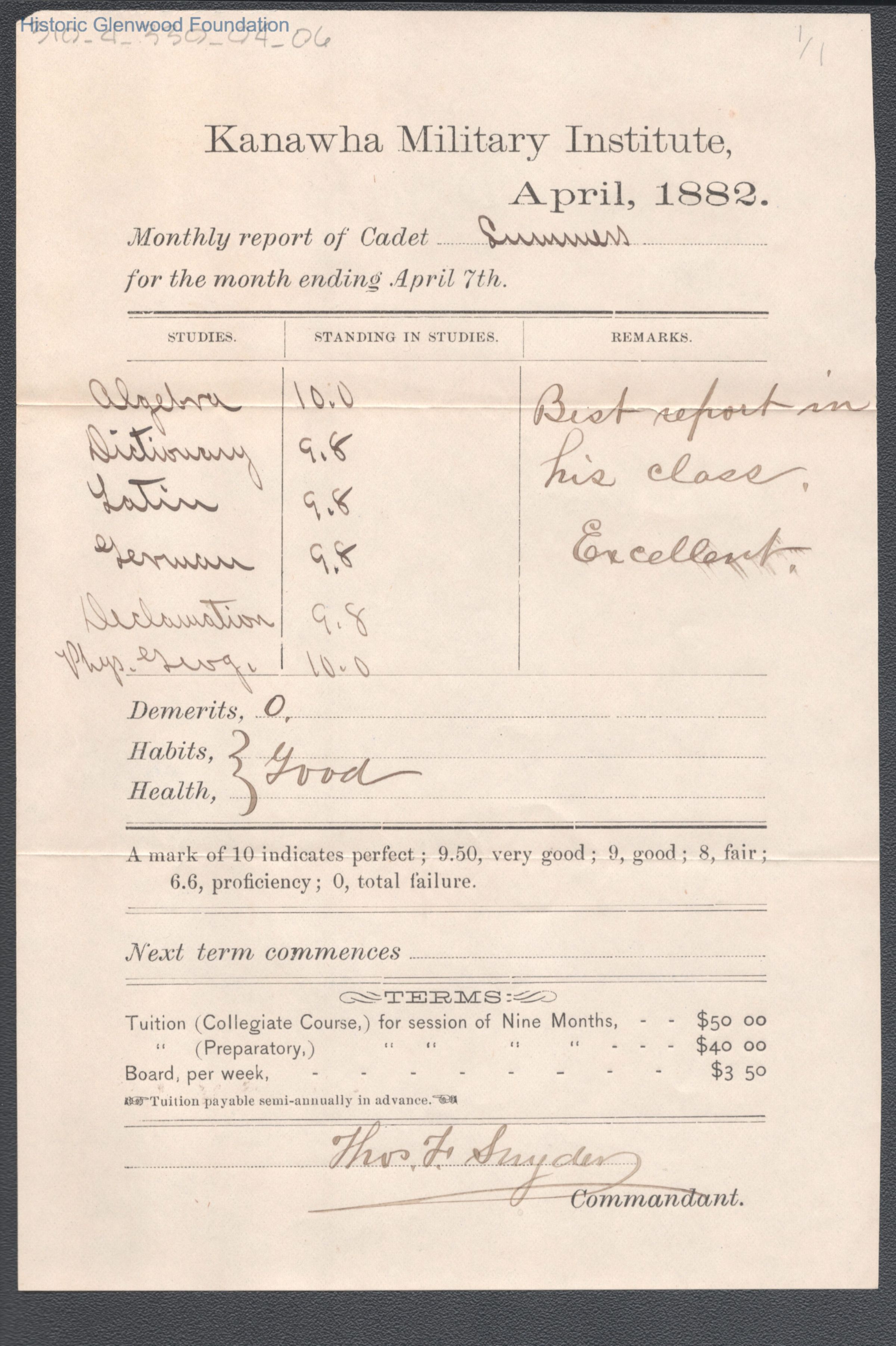 George W. Summers Progress Report, Kanawha Military Institute, Apr 7, 1882.