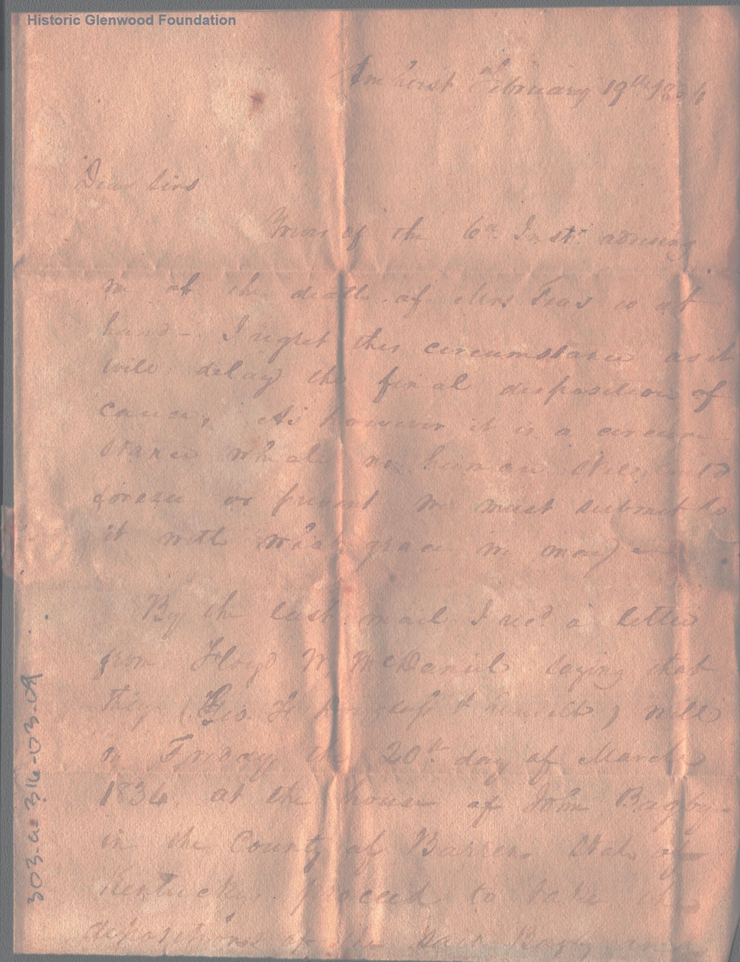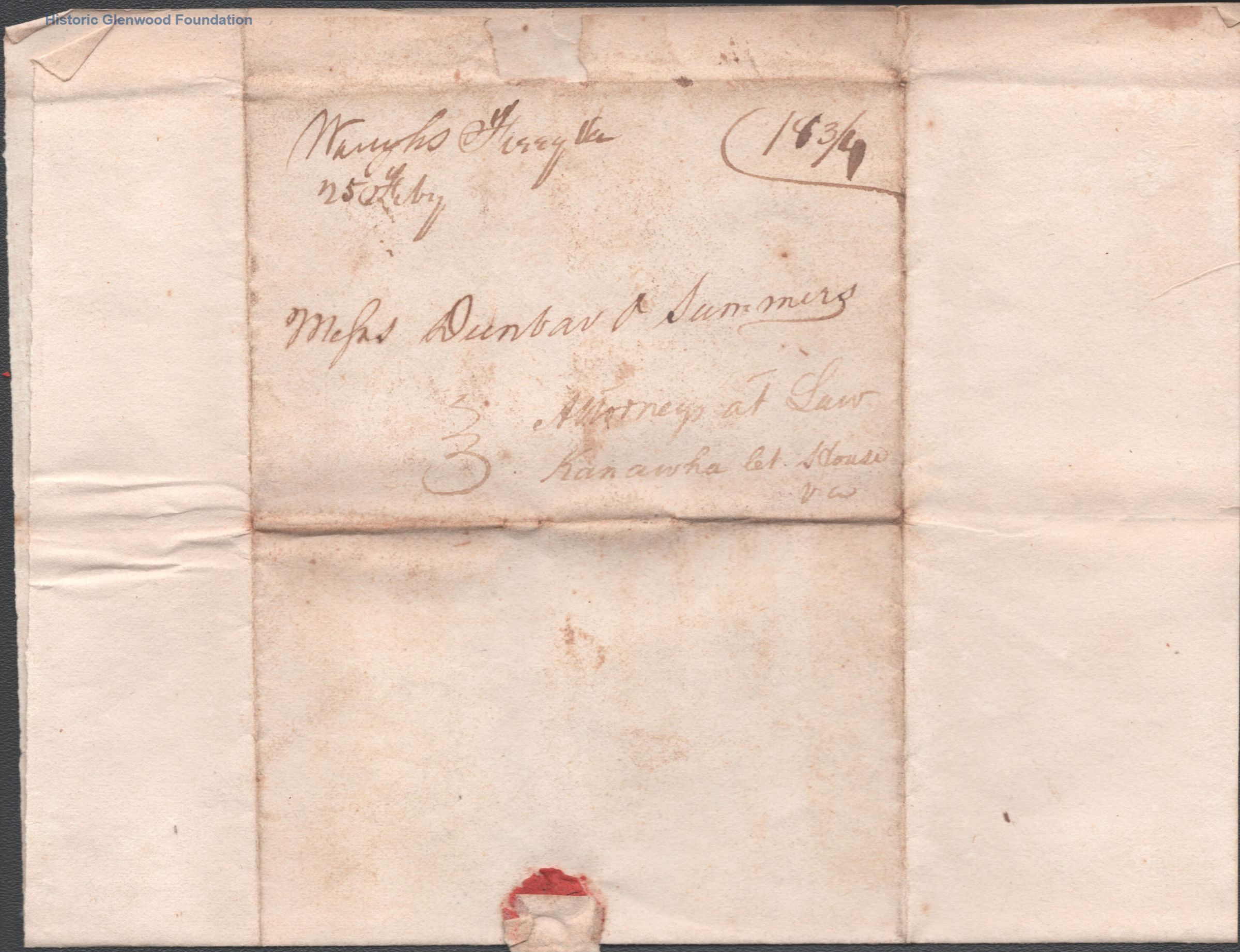 Business correspondence to Judge George Summers & Matthew Dunbar, author illegible; February 19, 1834Entry/Object ID