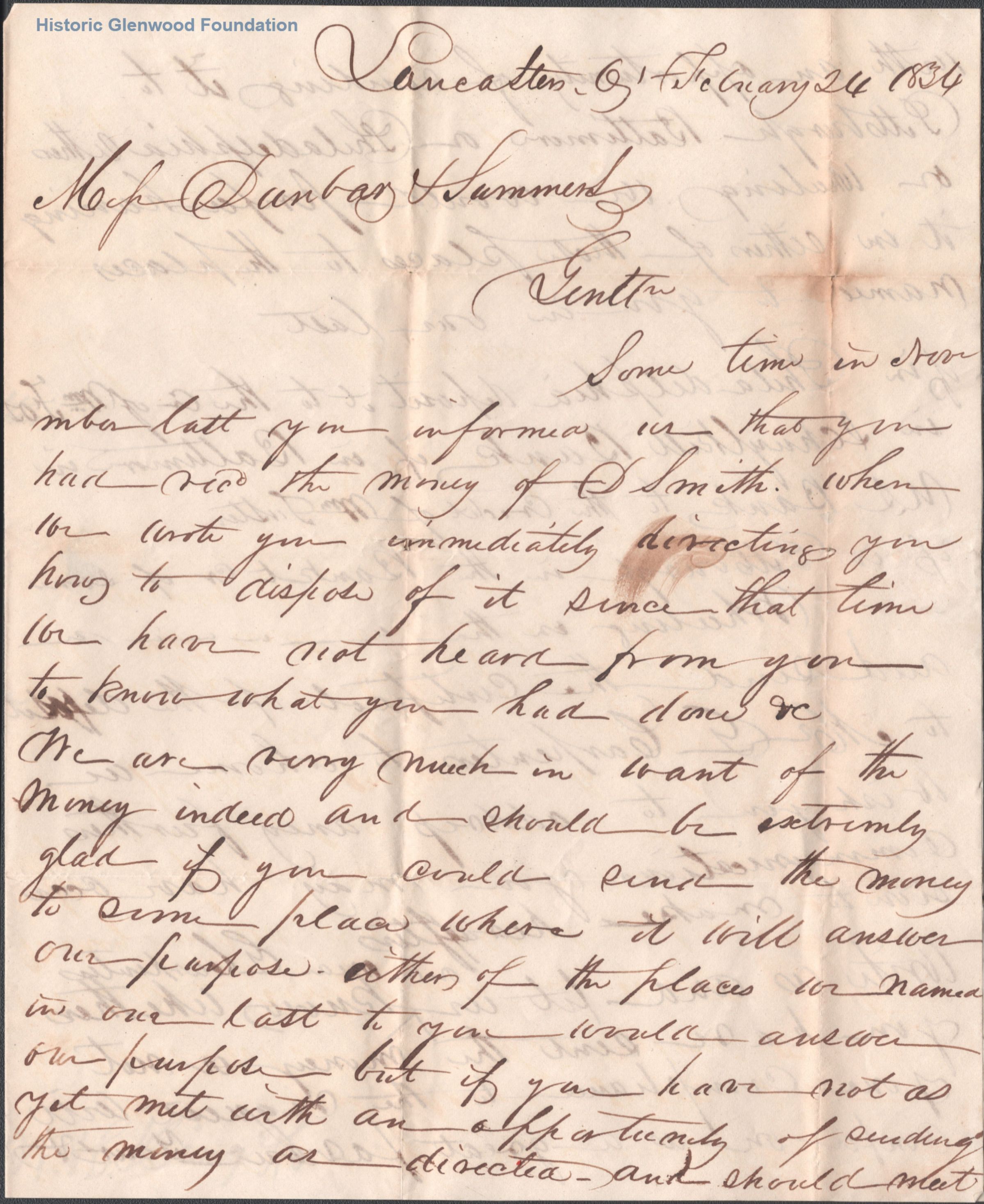 Business correspondence to Judge George Summers & Matthew Dunbar, author illegible, February 24, 1834Entry/Object ID