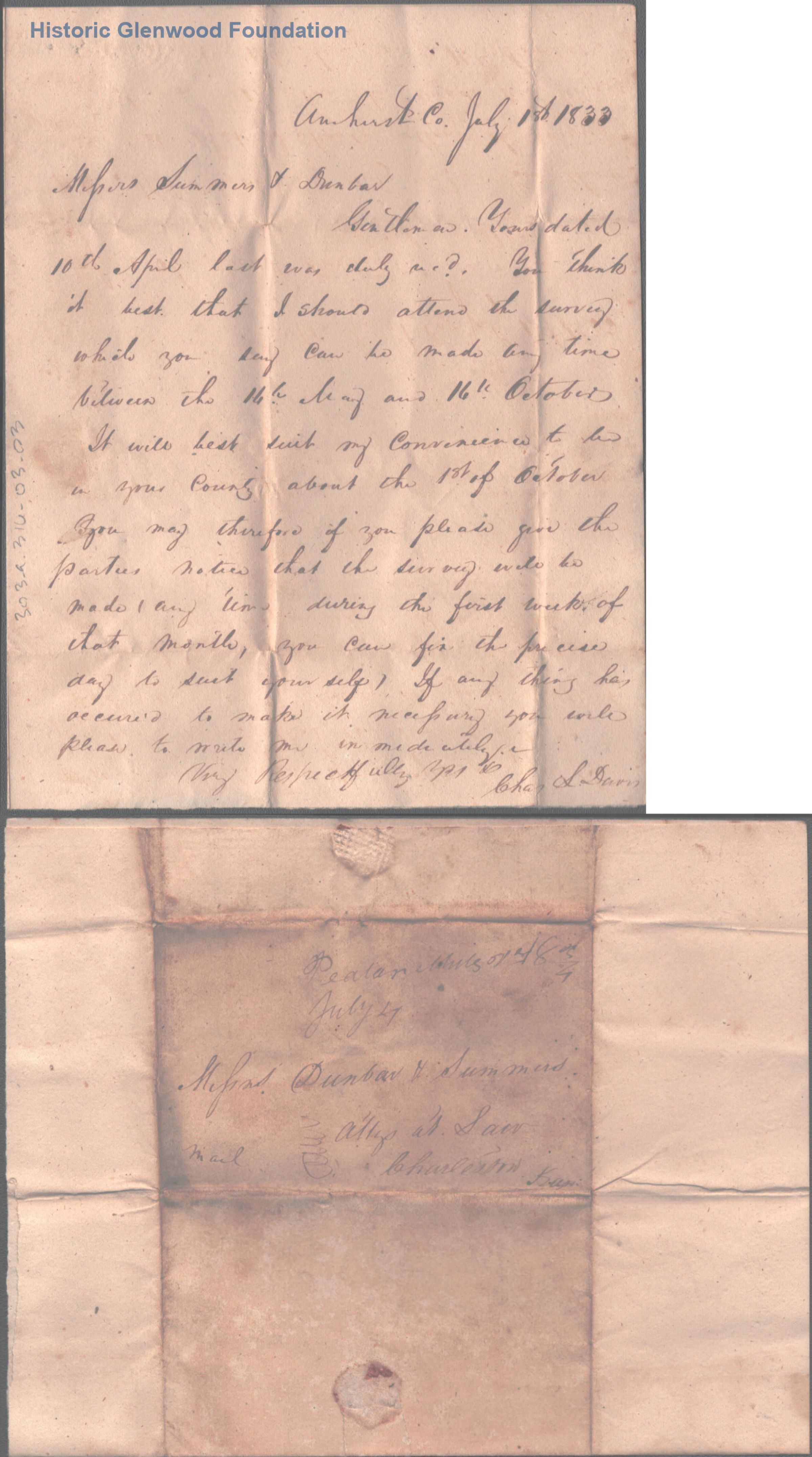 Business correspondence to Judge George Summers & Matthew Dunbar from Charles Davis, July 1, 1833Entry/Object ID