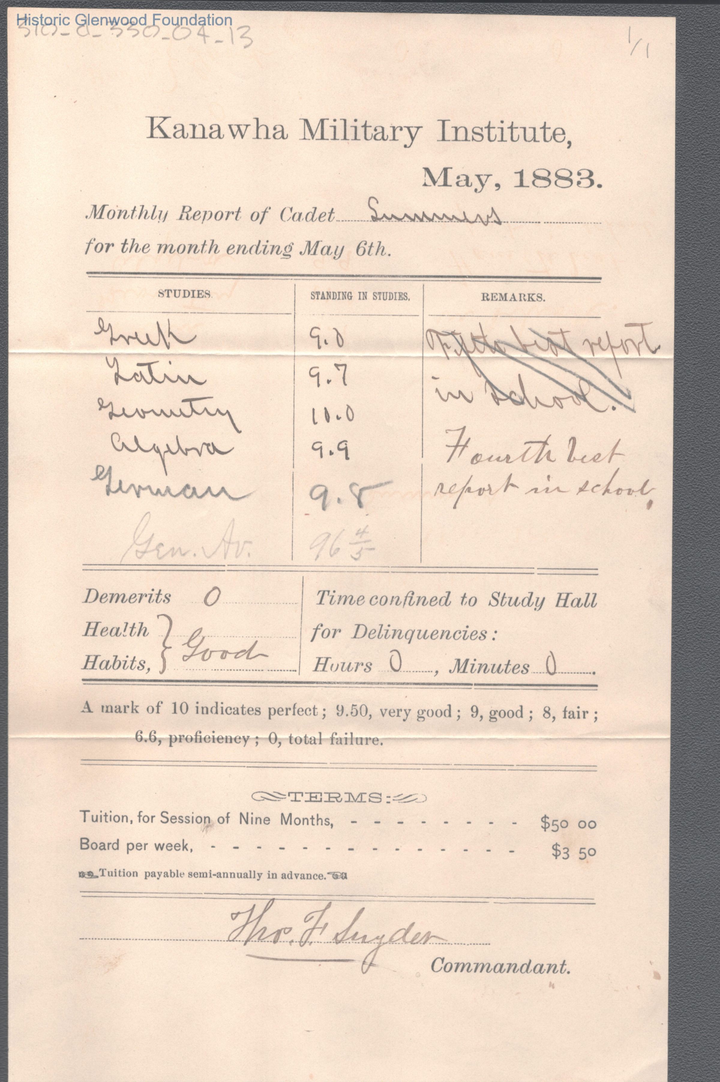 George W. Summers Progress Report, Kanawha Military Institute, May 6, 1883.