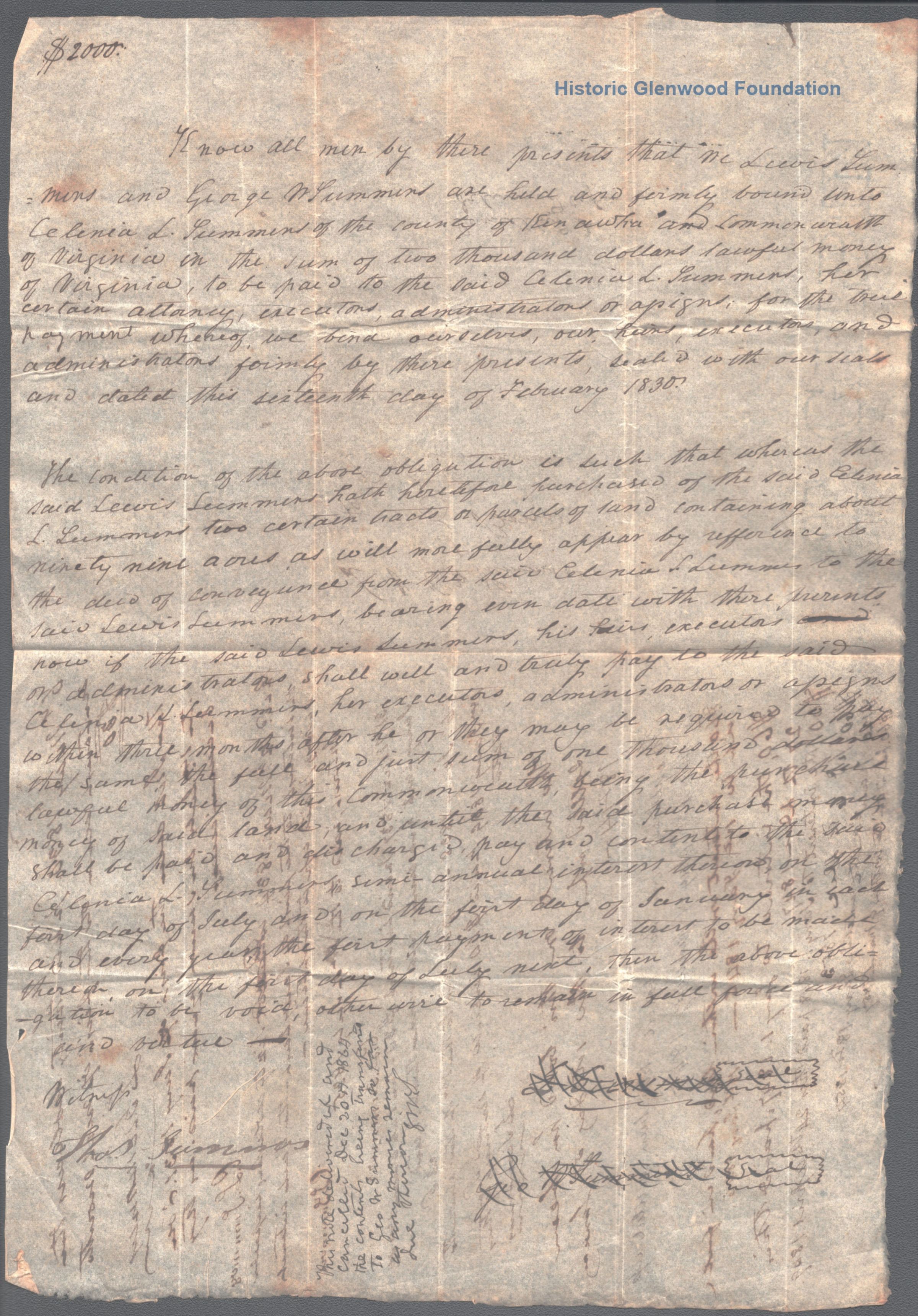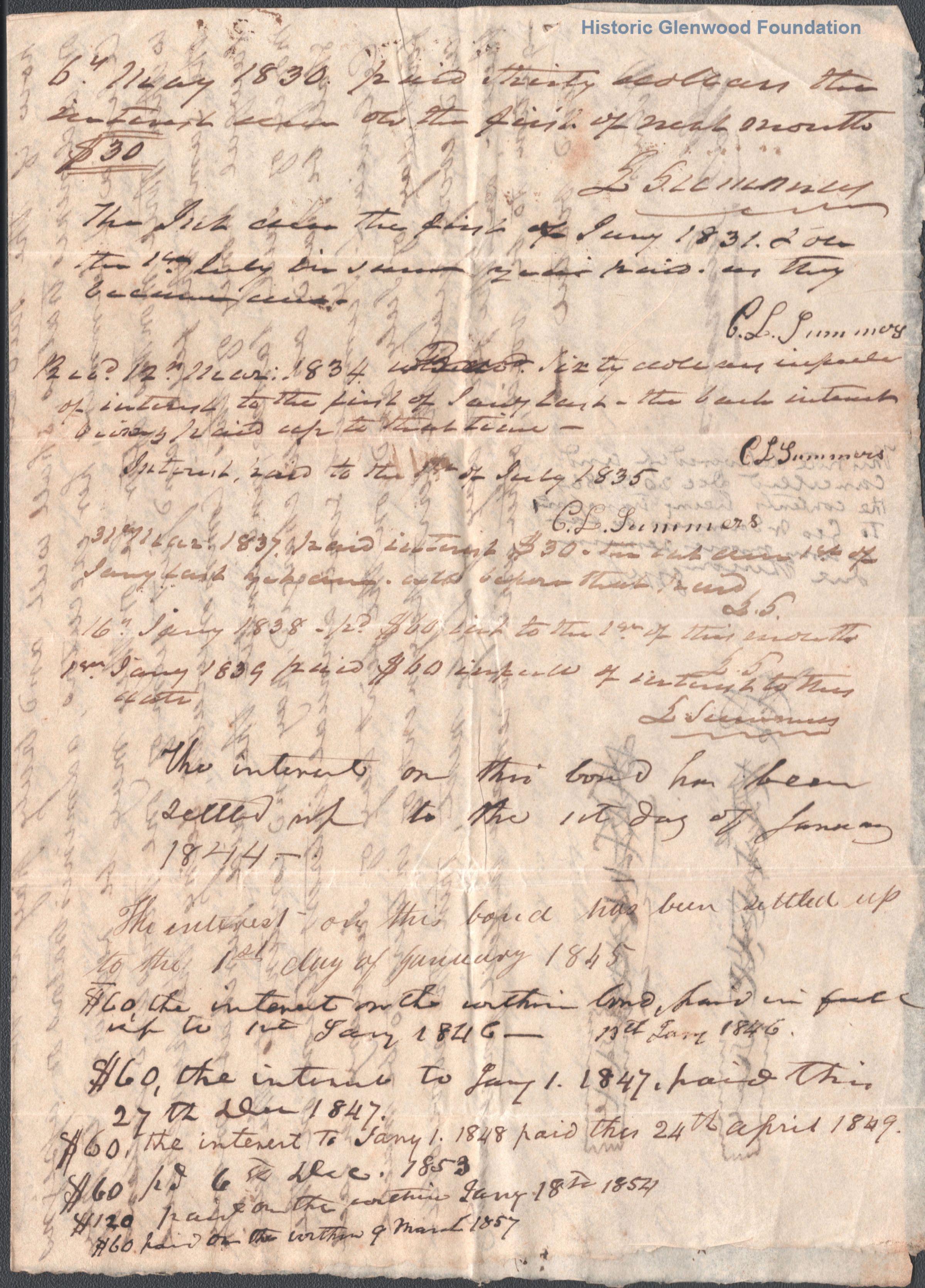 Bond agreement & record of payments made on account between Celena Summers & her brothers, Judges Lewis & George Summers