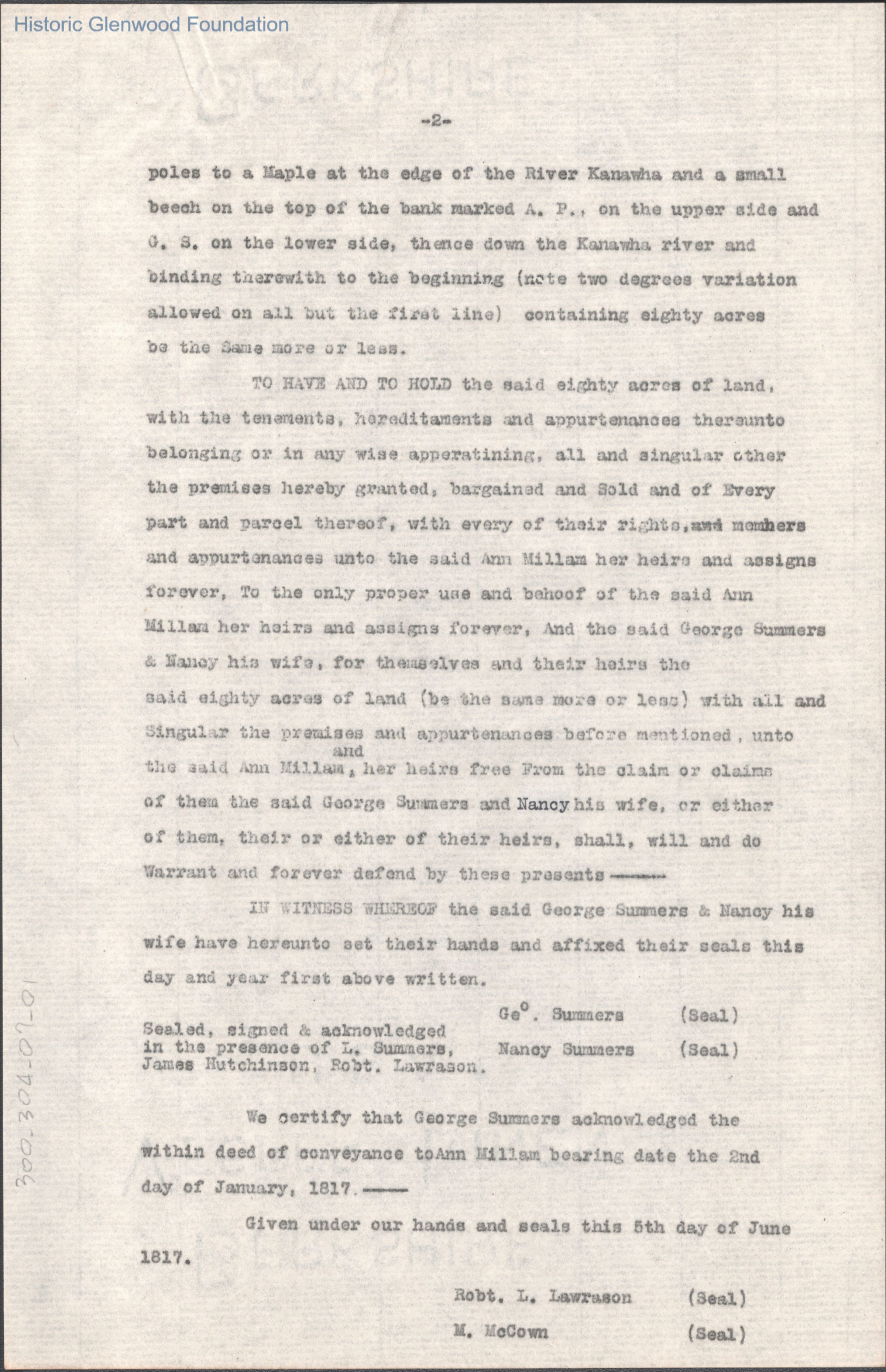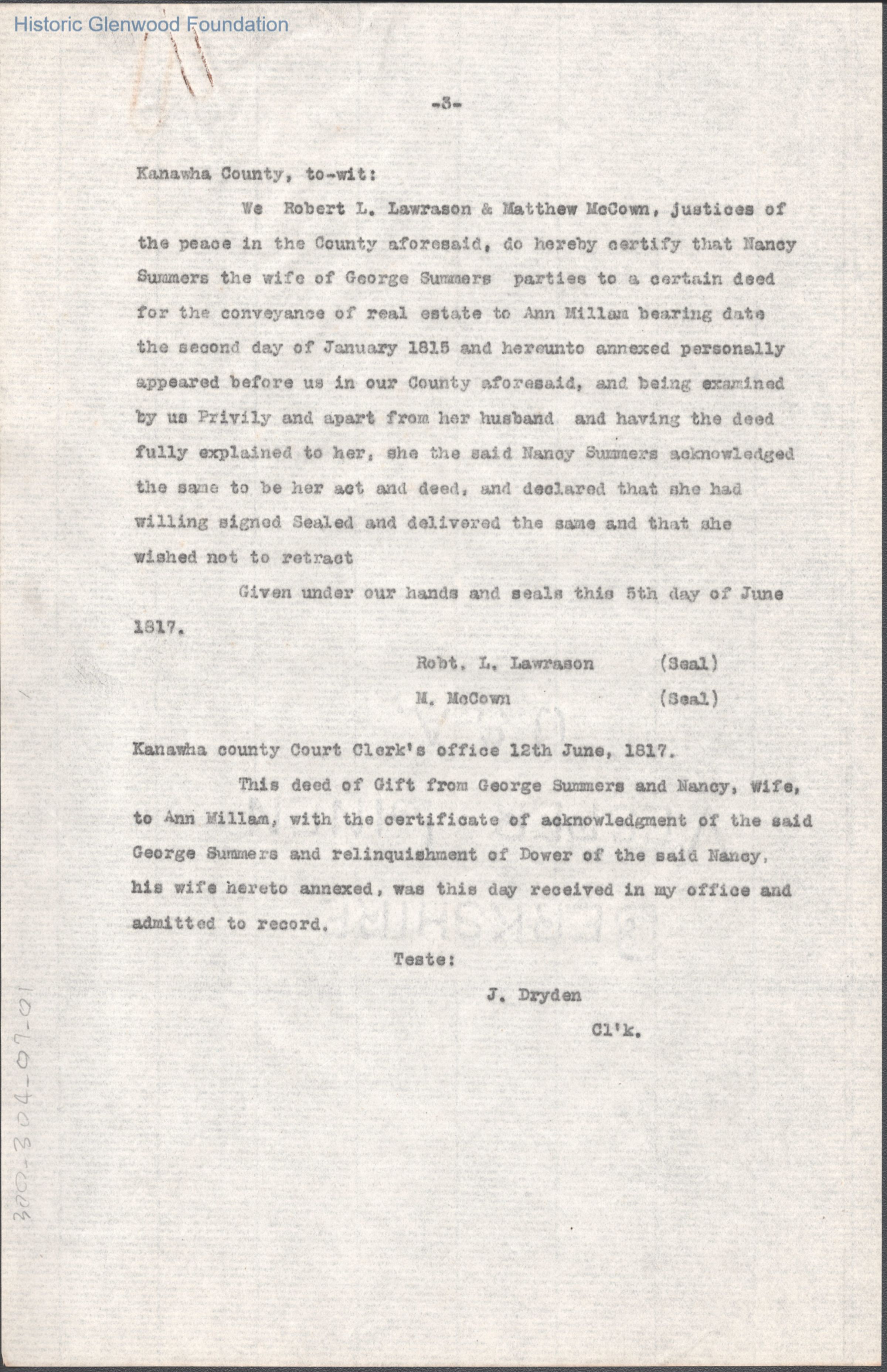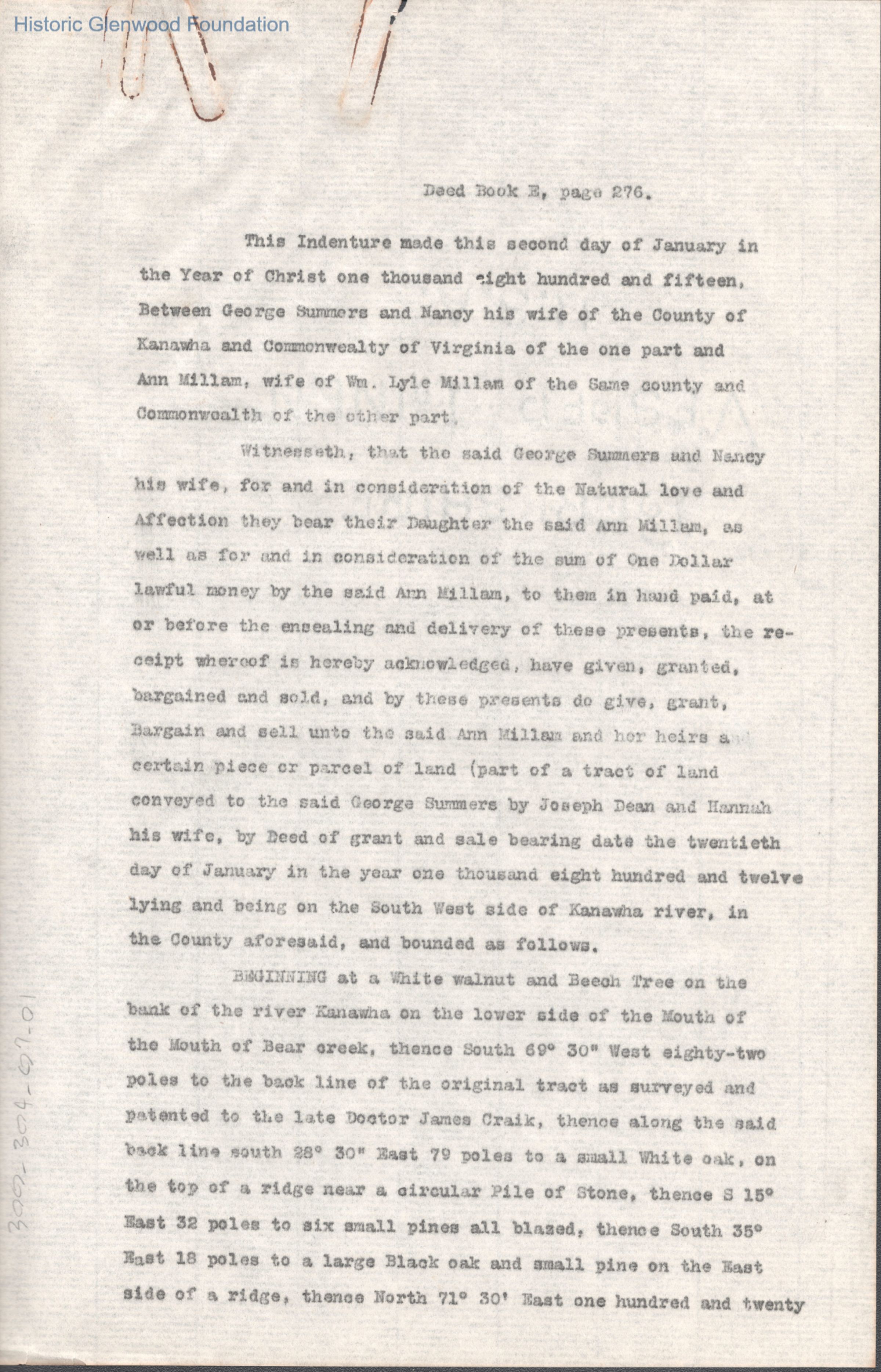 Col. George W. Summers & wife "Nancy," 1815 land transfer to daughter Ann MillamDate(s) of Creation