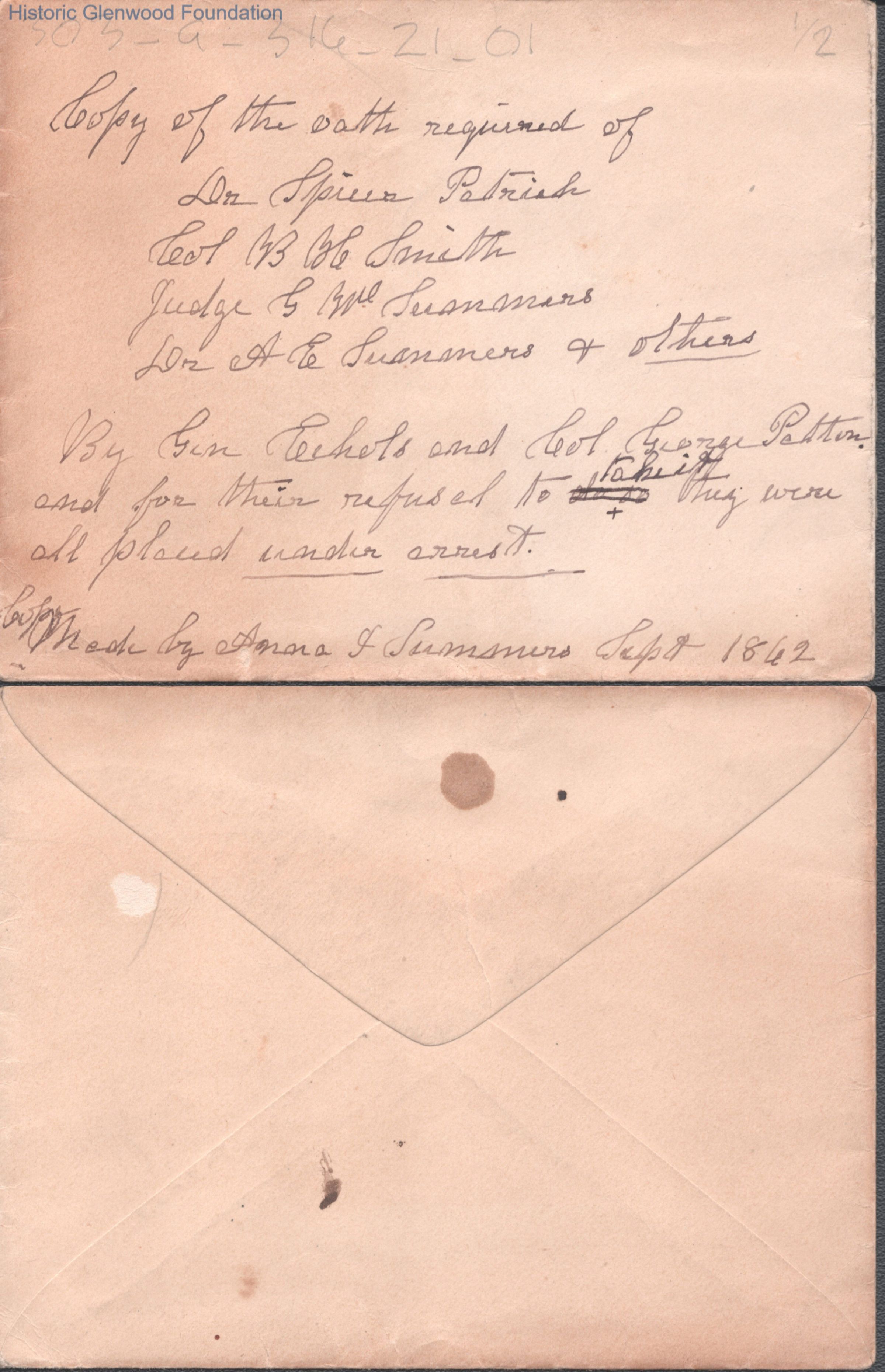 Envelope from Confederate oath required of Judge George Summers and others, Sep 1862.