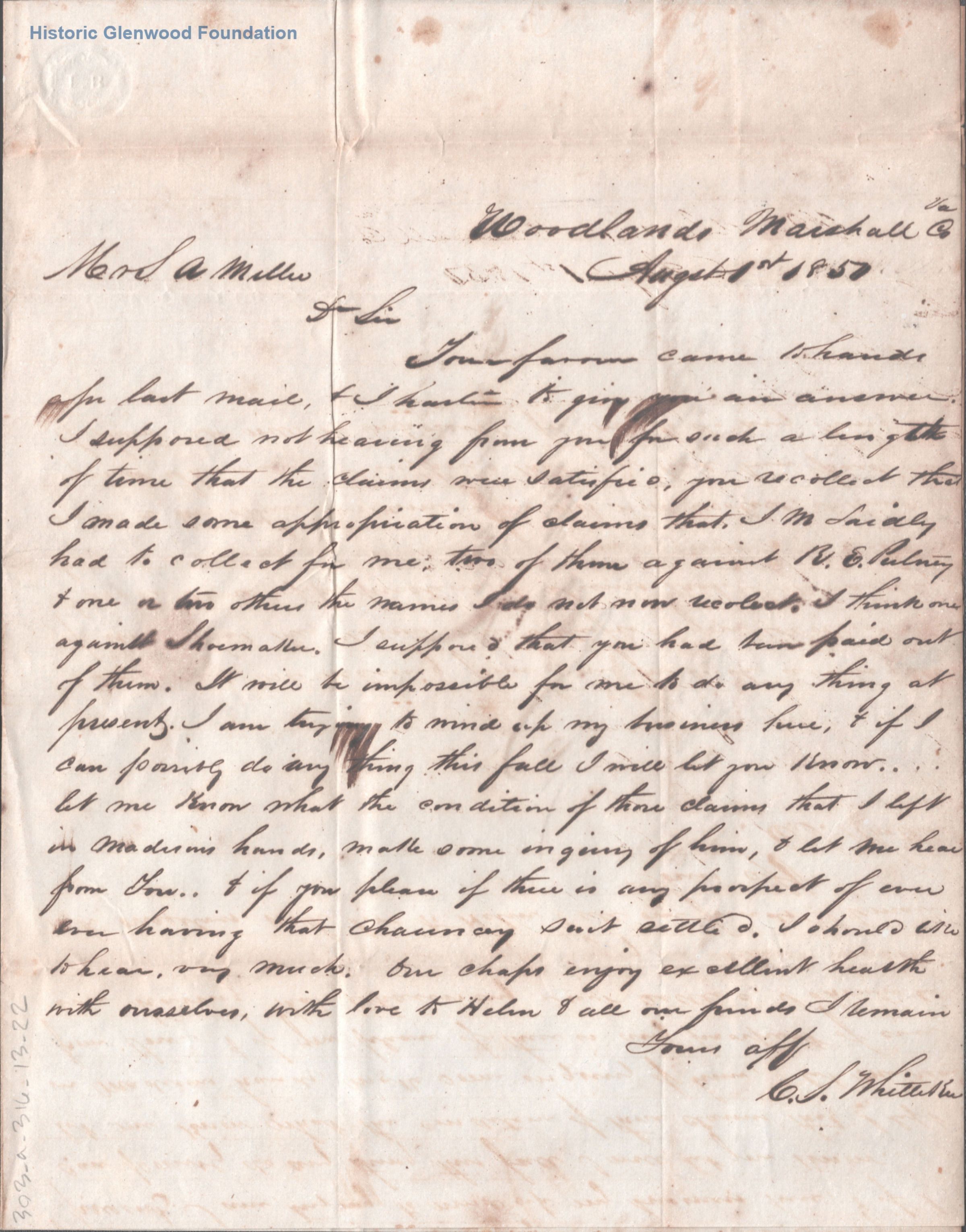 Letter to Samuel Miller of the partnership of Summers & Miller from C. S. Whittaker. Notes previous claims handled by J. M. Laidley & states belief that Miller was paid out of those claims; requests that Miller follows up with Laidley on his behalfDate(s) of Creation