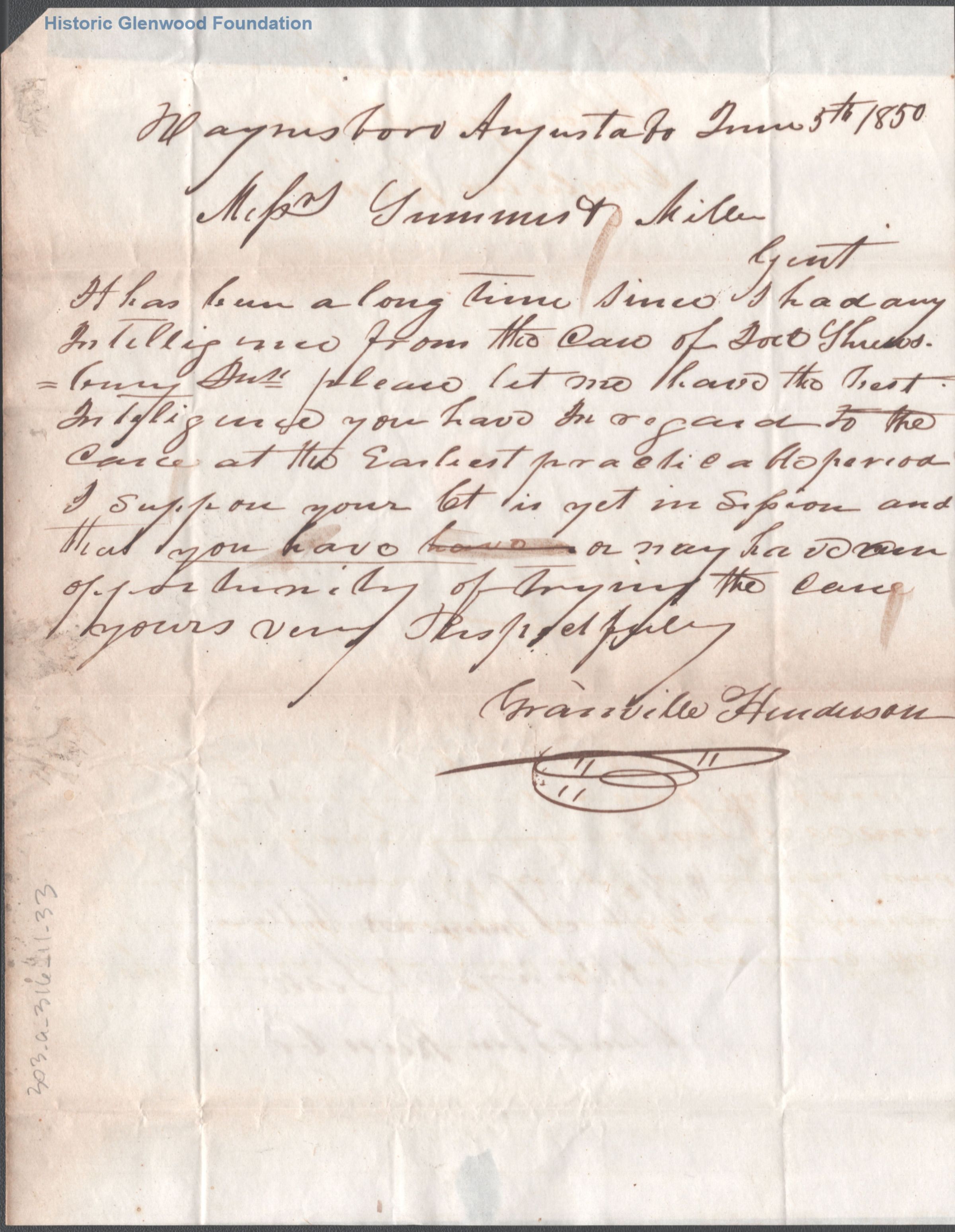 Correspondence from legal client of Summers & Miller: G. Henderson; June 5, 1850