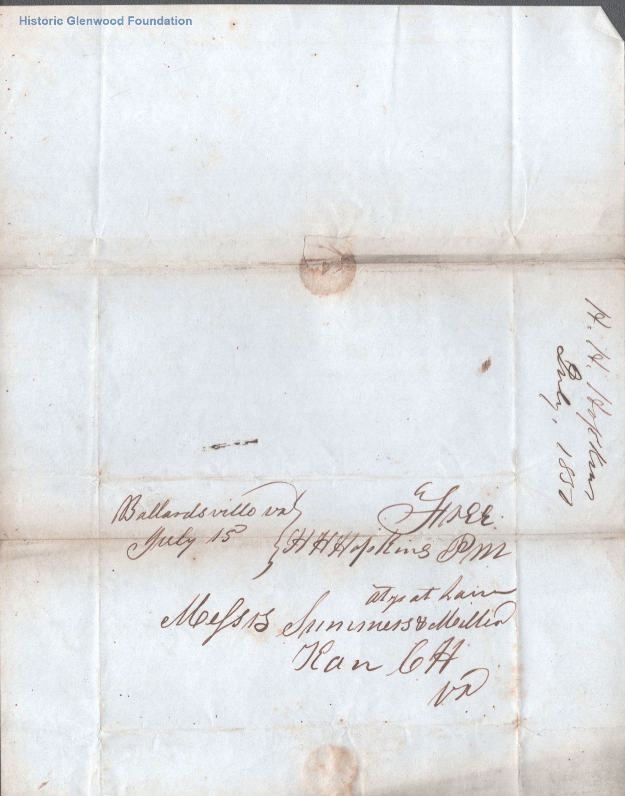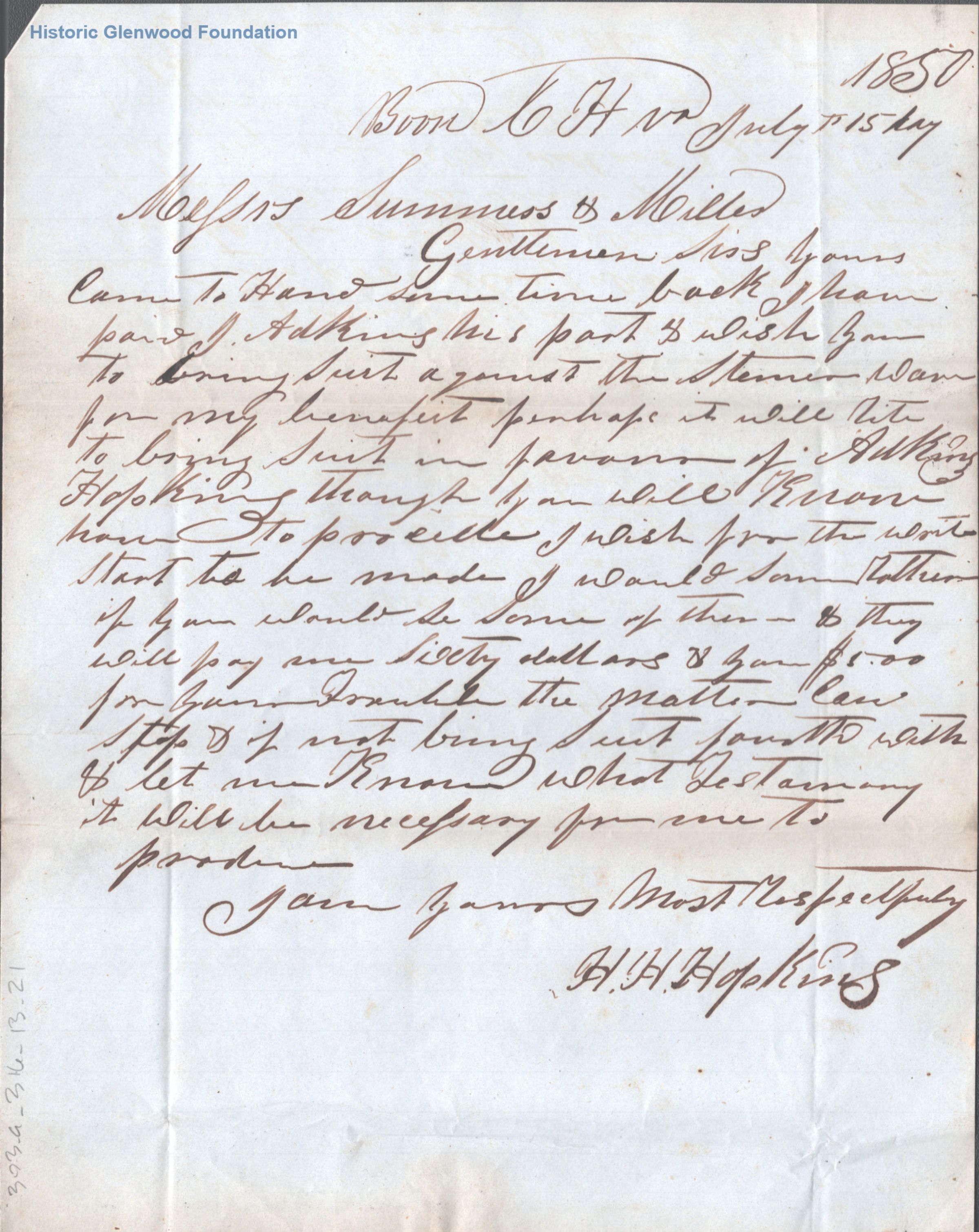 Correspondence from legal client of Summers & Miller: H. H. Hopkins; July 15, 1850