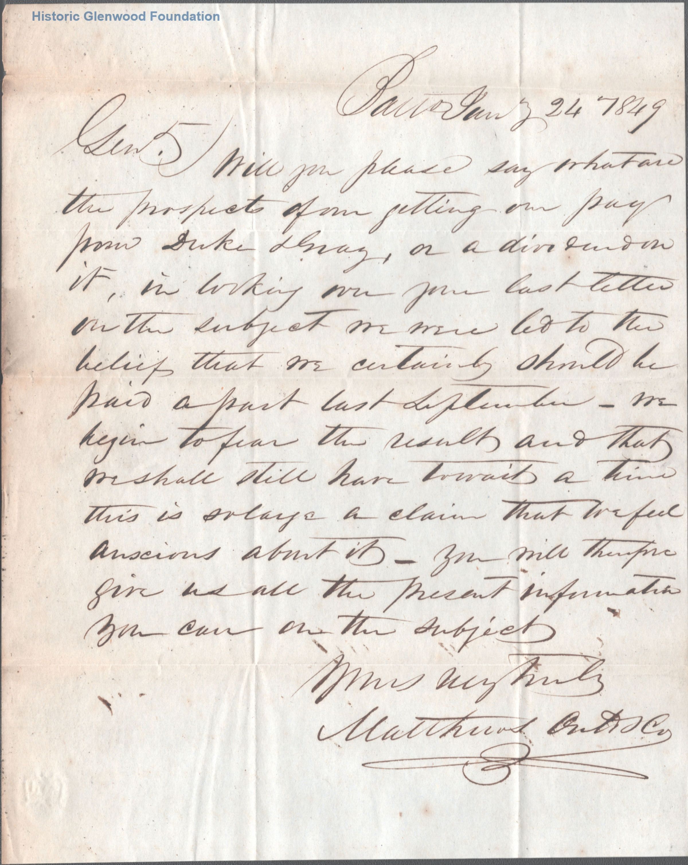 Correspondence from legal client of Summers & Miller: Matthew O[?]; January 24, 1849