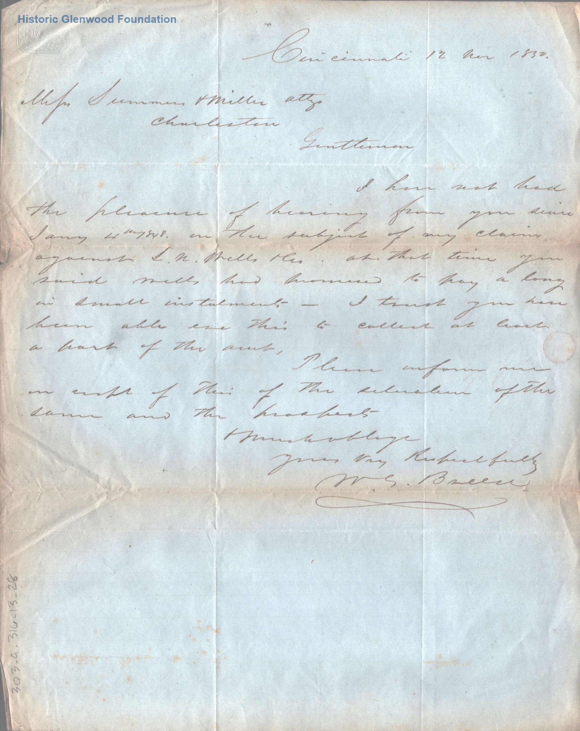 Letter to partnership of Summers & Miller from W. S. Breece requesting update on claim against L. N. Wells