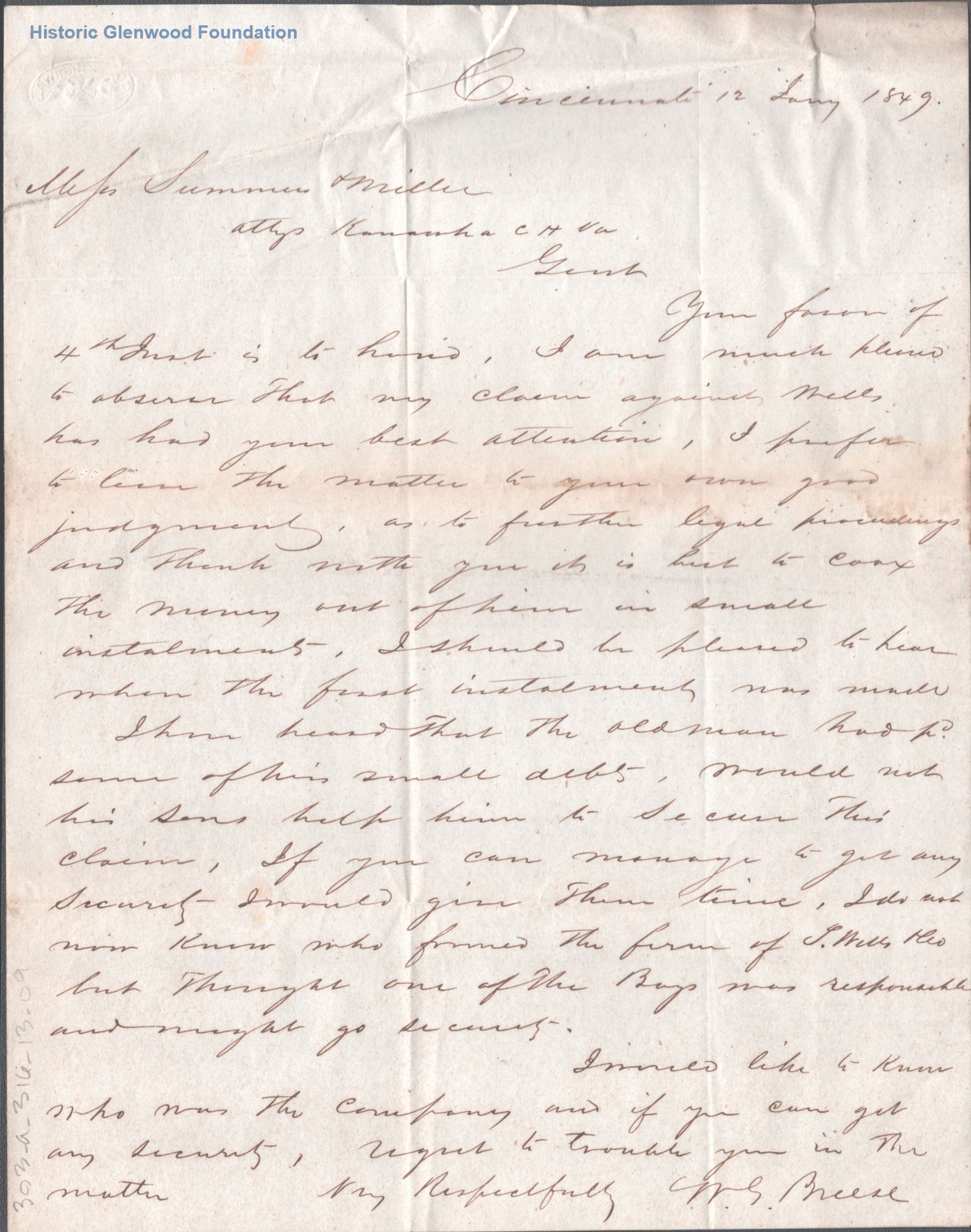 Letter to the law partnership of Summers & Miller from William Bruse about his case against Wells.