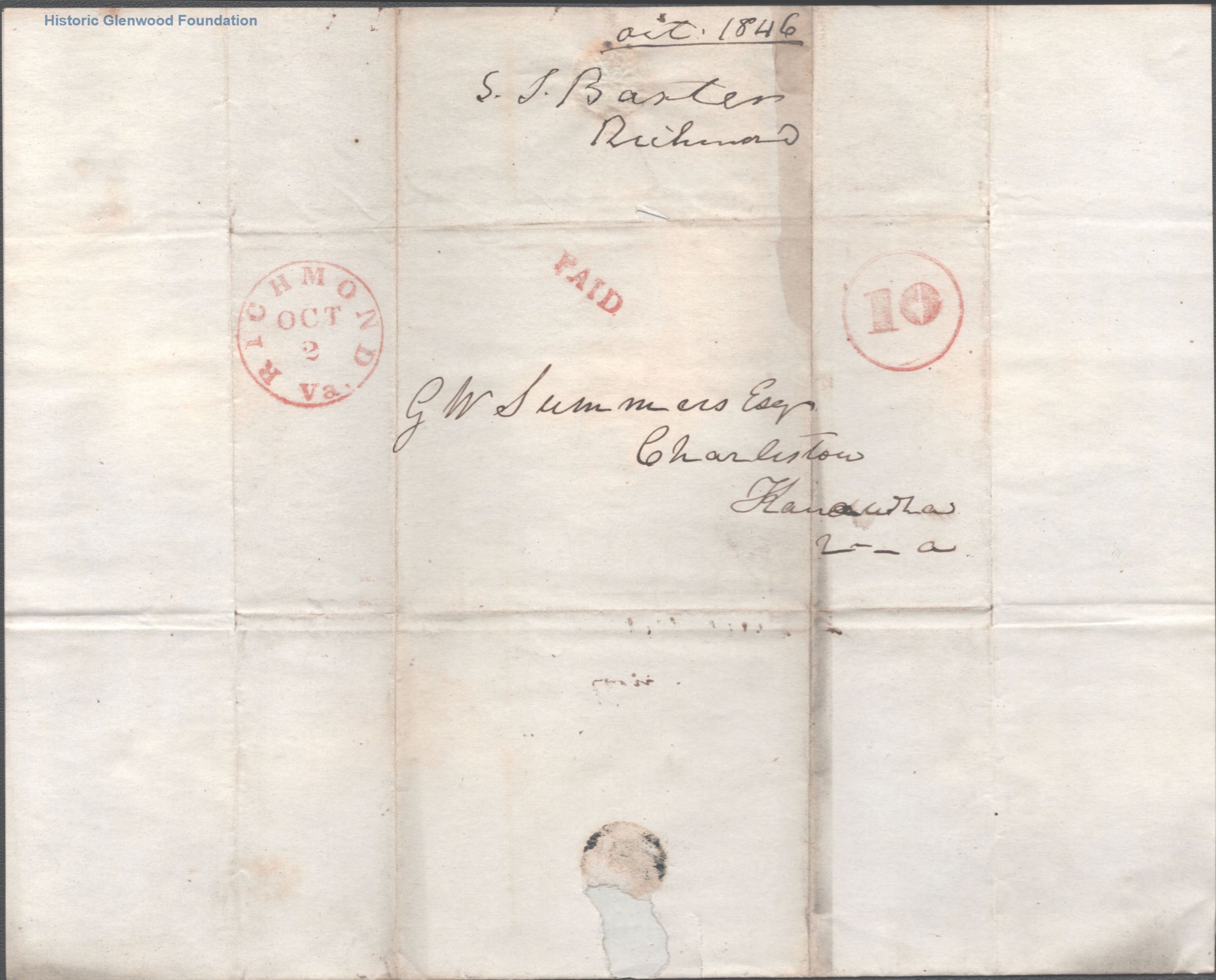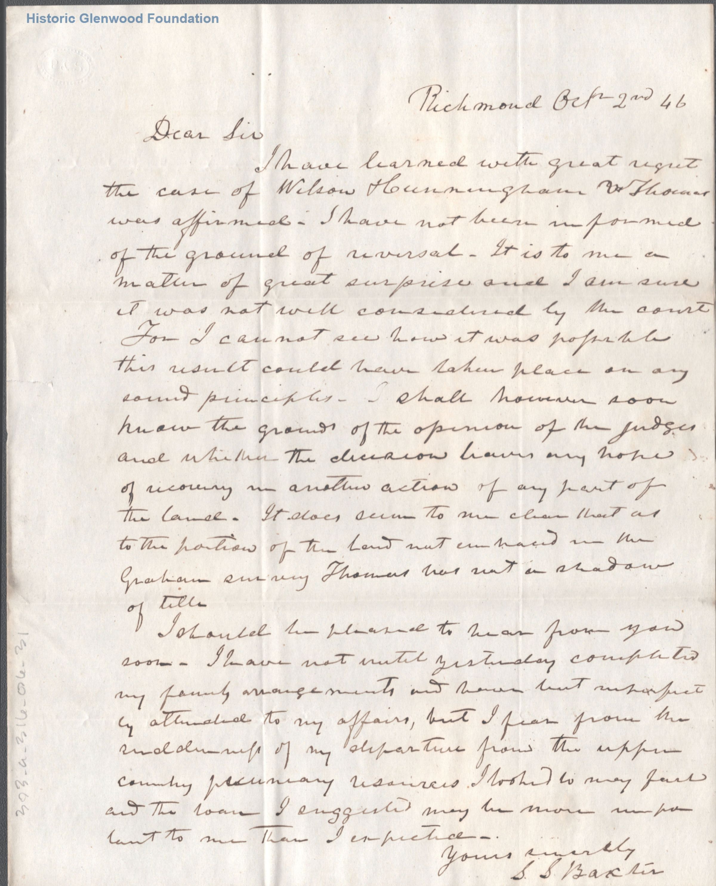Correspondence from S. S. Baxter; October 2, 1846