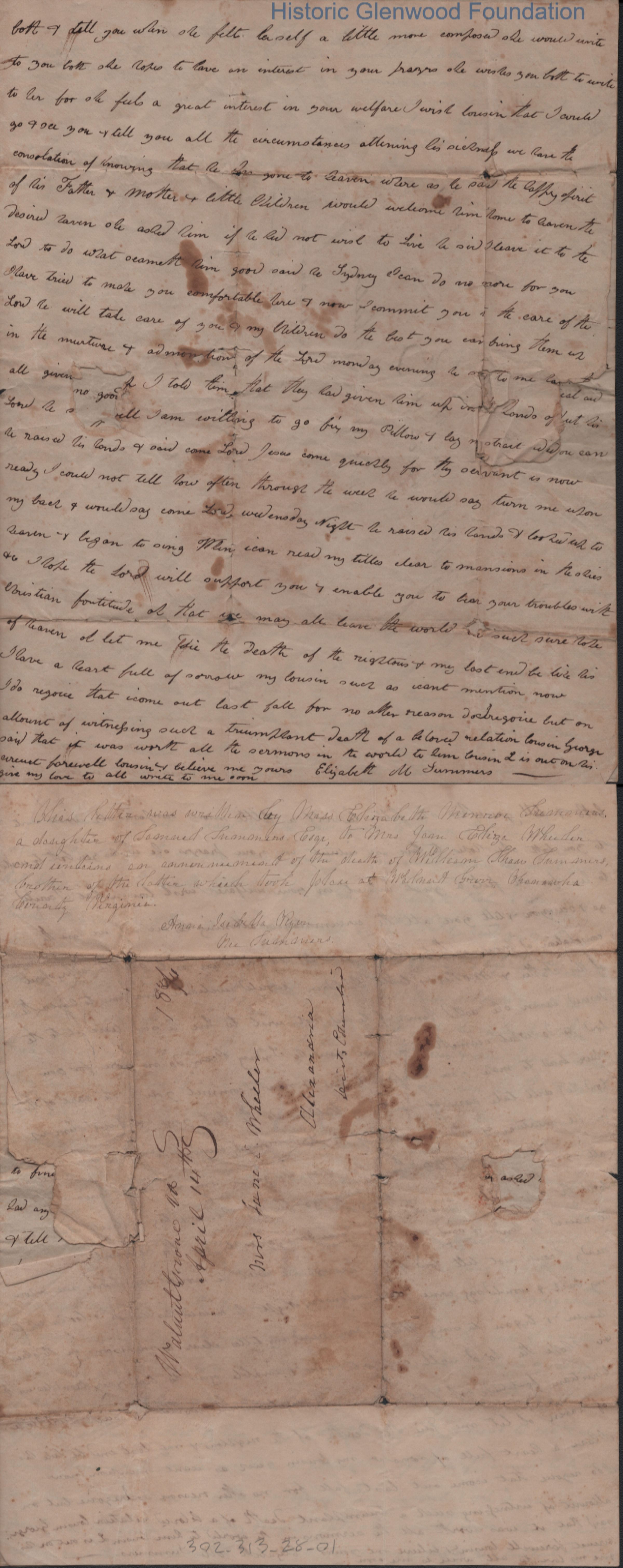 Letter from Elizabeth Summers to Jane Wheeler, informing her of the death of Mrs. Wheeler's brother, William Shaw Summers. Pencilled note by Anna Summers Ryon identifies author & recipient.