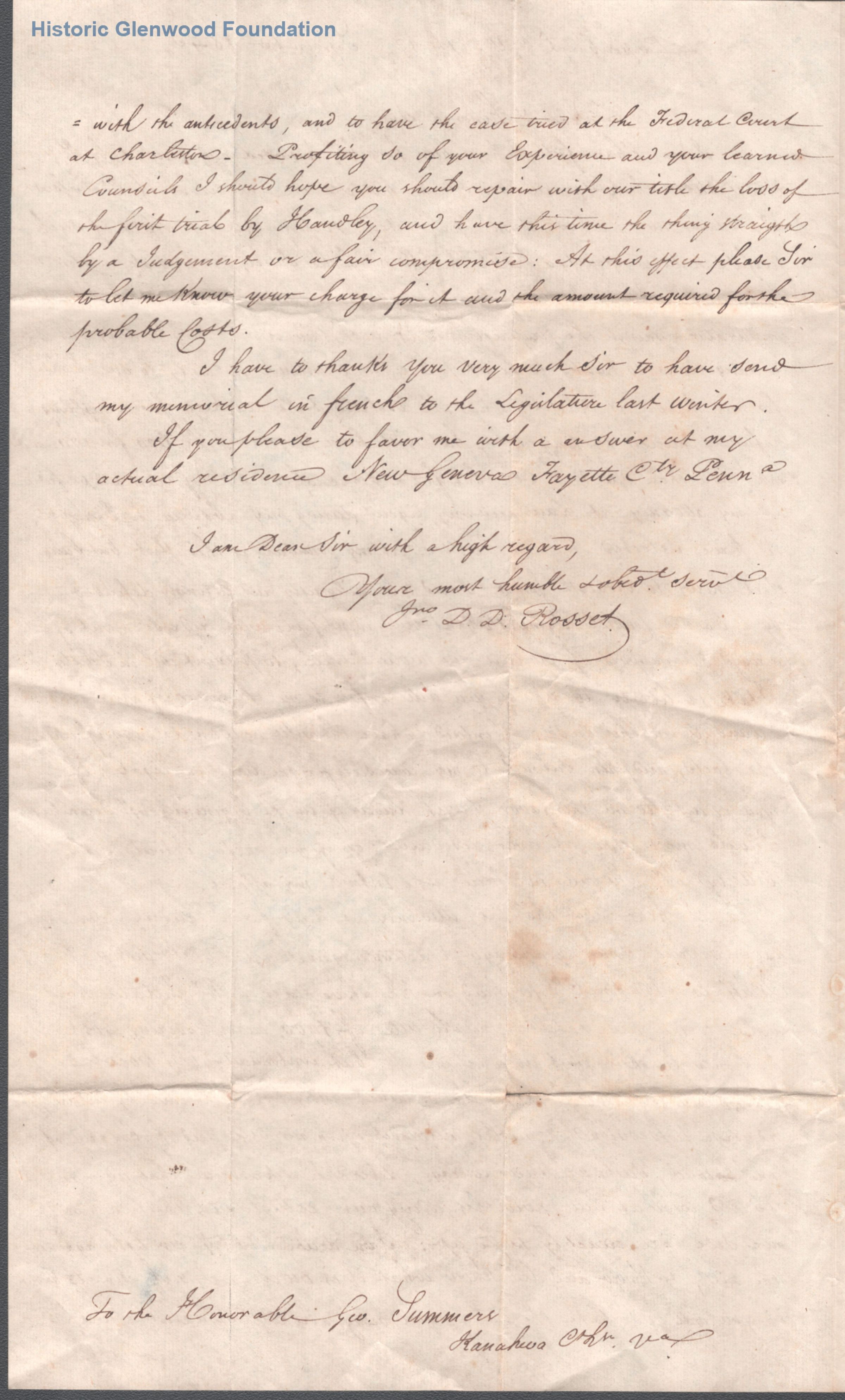 Letter from D. D. Rosset to George Summers requesting to engage his professional services